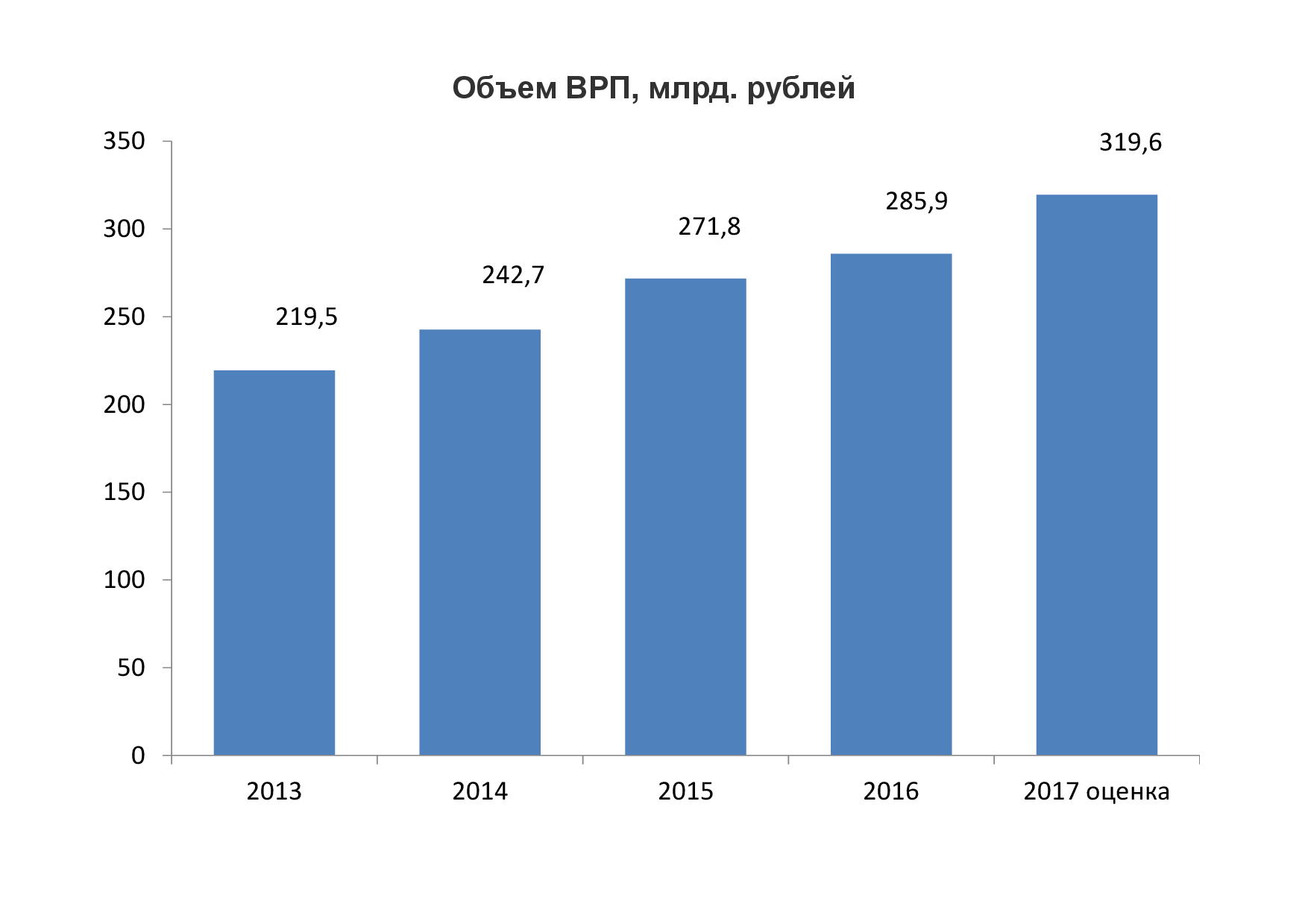 Объем валового регионального продукта в 2016 году составил 285,9 млрд. рублей или 100,3 процента в сопоставимых ценах к уровню 2015 года, в 2017 году он оценивается в 319,6 млрд. рублей (101,3 процента к уровню 2016 года).