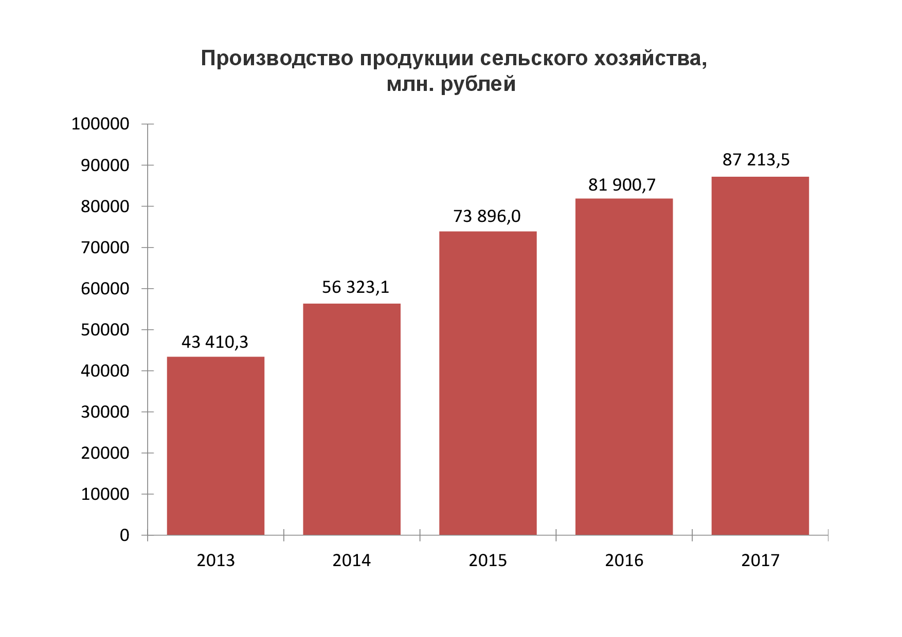 В 2017 году объем производства продукции сельского хозяйства в действующих ценах во всех категориях хозяйств составил 87,2 млрд. рублей или 106,4 процента в сопоставимых ценах к уровню 2016 года, в том числе продукции растениеводства – 35,6 млрд. рублей (109,1 процента), продукции животноводства – 51,7 млрд. рублей (104,6 процента).