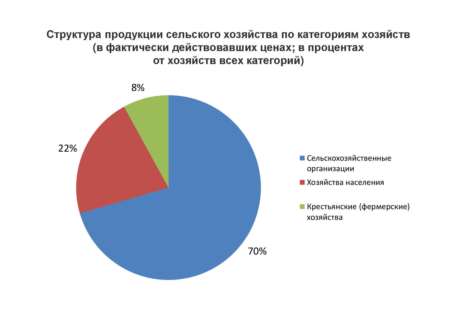 В 2017 году по категориям хозяйств сложилась следующая структура производства: 21,5 процента продукции произведено личными хозяйствами населения; 70,5 процента – сельхозорганизациями и 8,0 процентов – фермерскими хозяйствами.