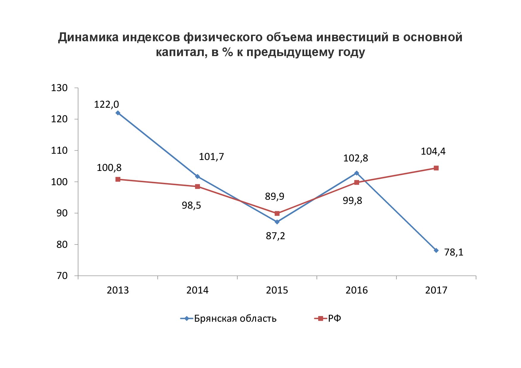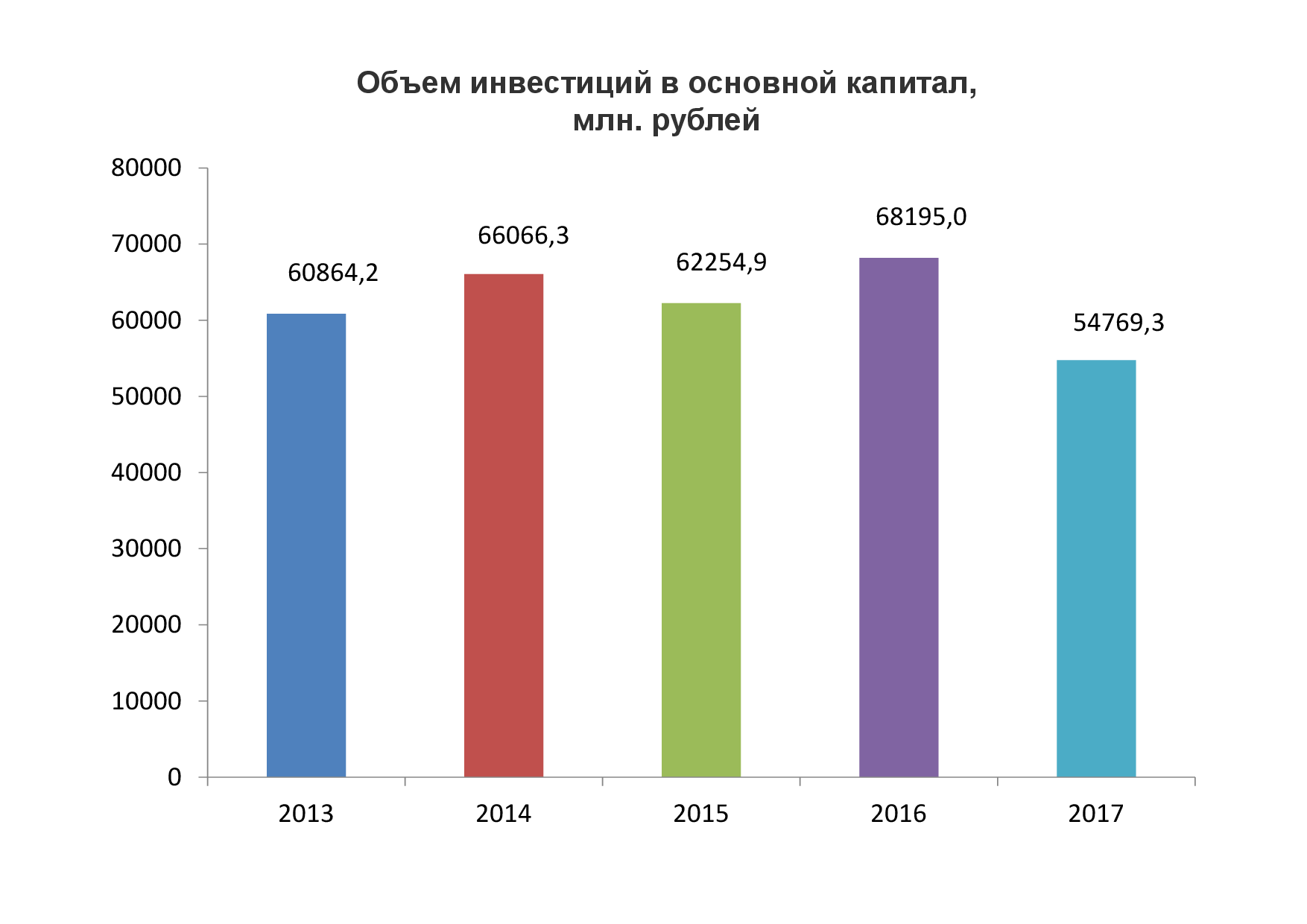 Объем инвестиций в основной капитал за счет всех источников финансирования в 2017 году составил 54,8 млрд. рублей или 78,1 процента к уровню 2016 года в сопоставимых ценах.
