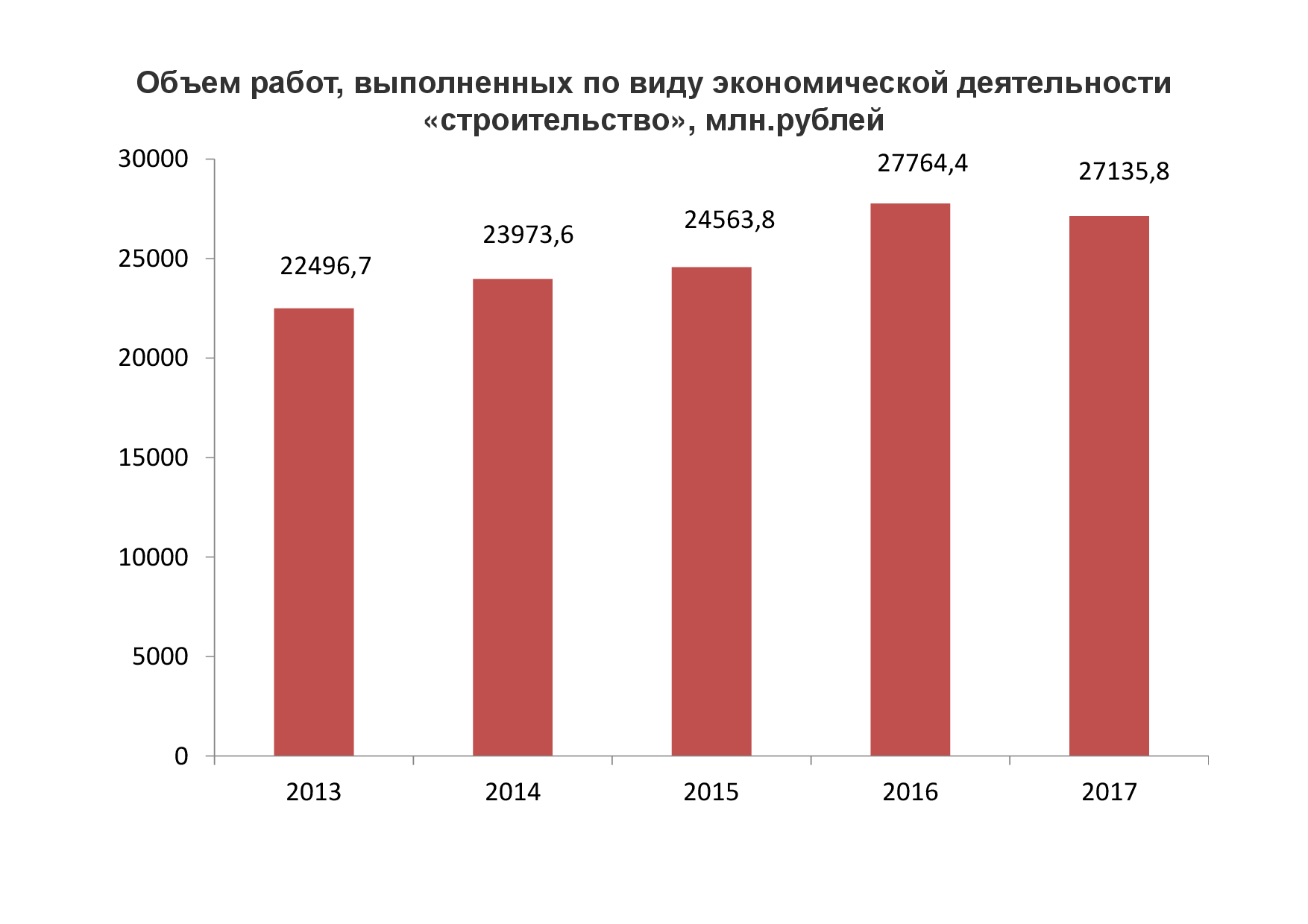Объем работ, выполненных по виду деятельности "строительство", в 2017 году составил 27,1 млрд. рублей или 92,0 процента к уровню 2016 года.