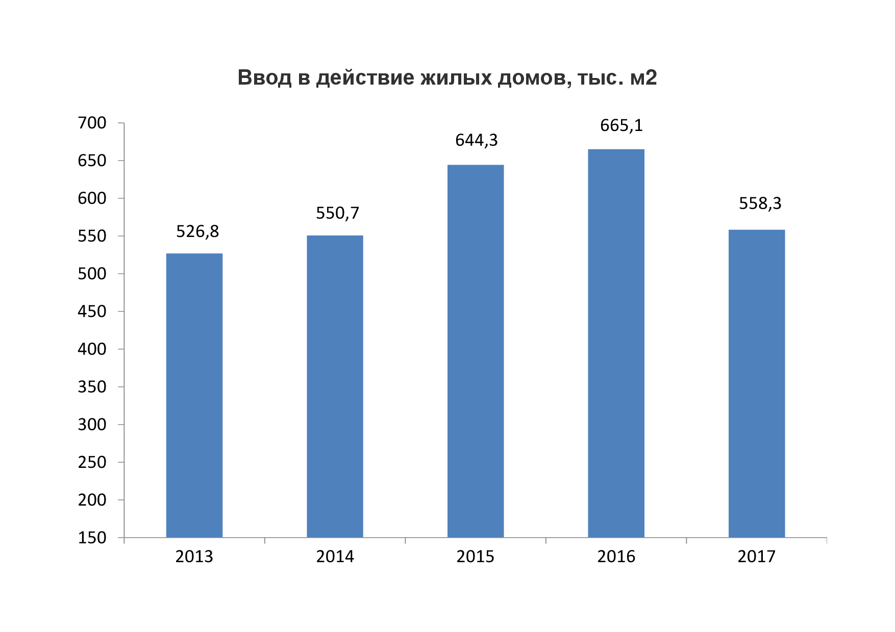 Введено в эксплуатацию 558,3 тыс. кв. метров общей площади жилых домов или 83,9 процента к уровню 2016 года.