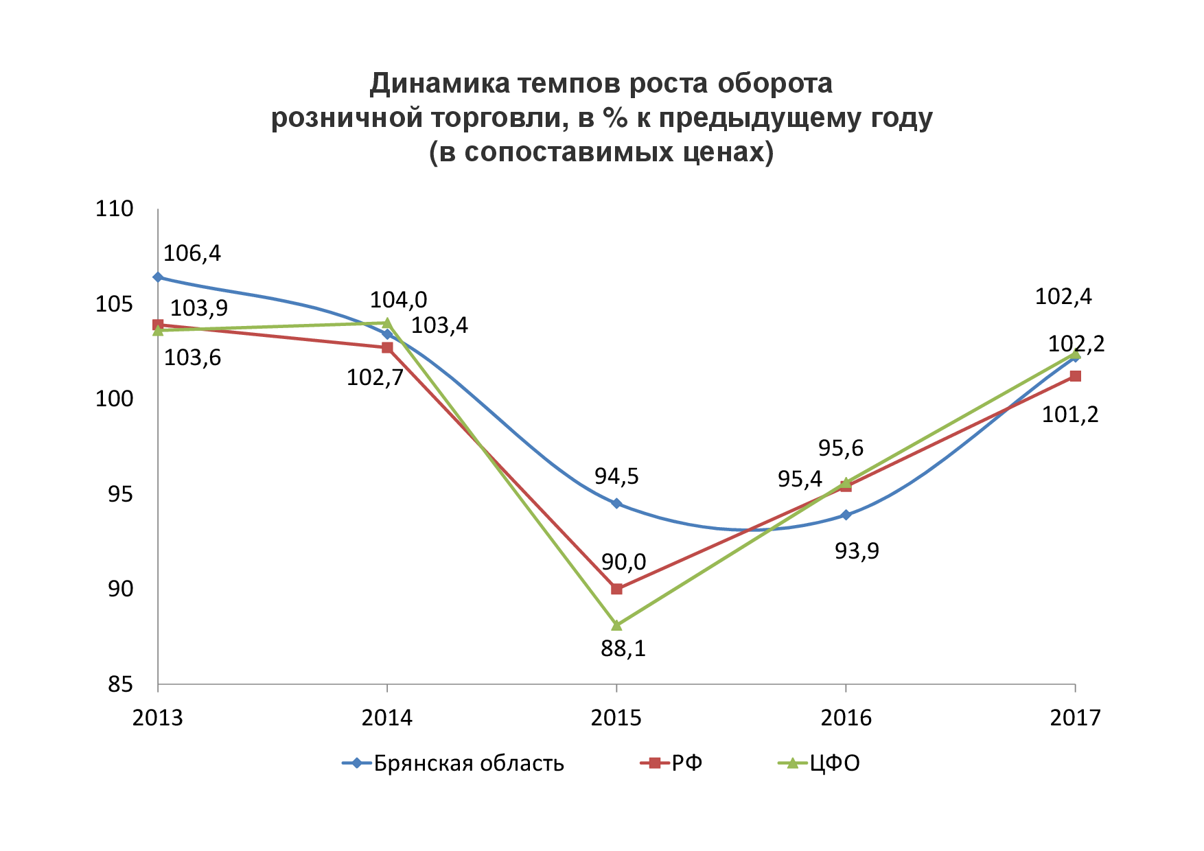 Оборот розничной торговли за 2017 год составил 234,4 млрд. рублей, что на 2,2 процента больше, чем за 2016 год (в сопоставимых ценах). В структуре оборота розничной торговли доля продовольственных товаров составила 45,8 процента, непродовольственных – 54,2 процента.