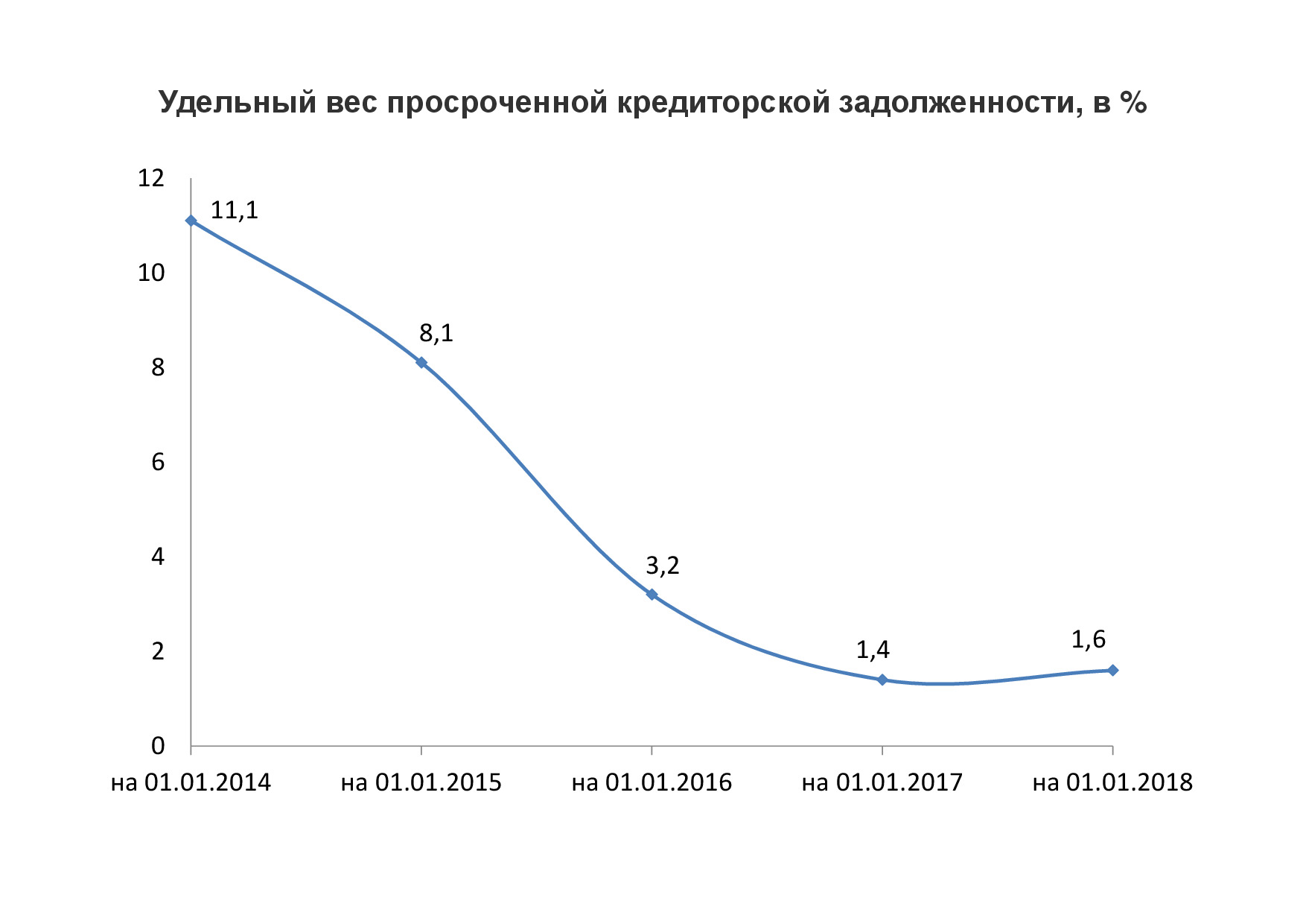 Кредиторская задолженность в целом по области по состоянию на 1 января 2018 года составила 142,2 млрд. рублей, из нее просроченная – 2,3 млрд. рублей (1,6 процента в общей сумме задолженности).