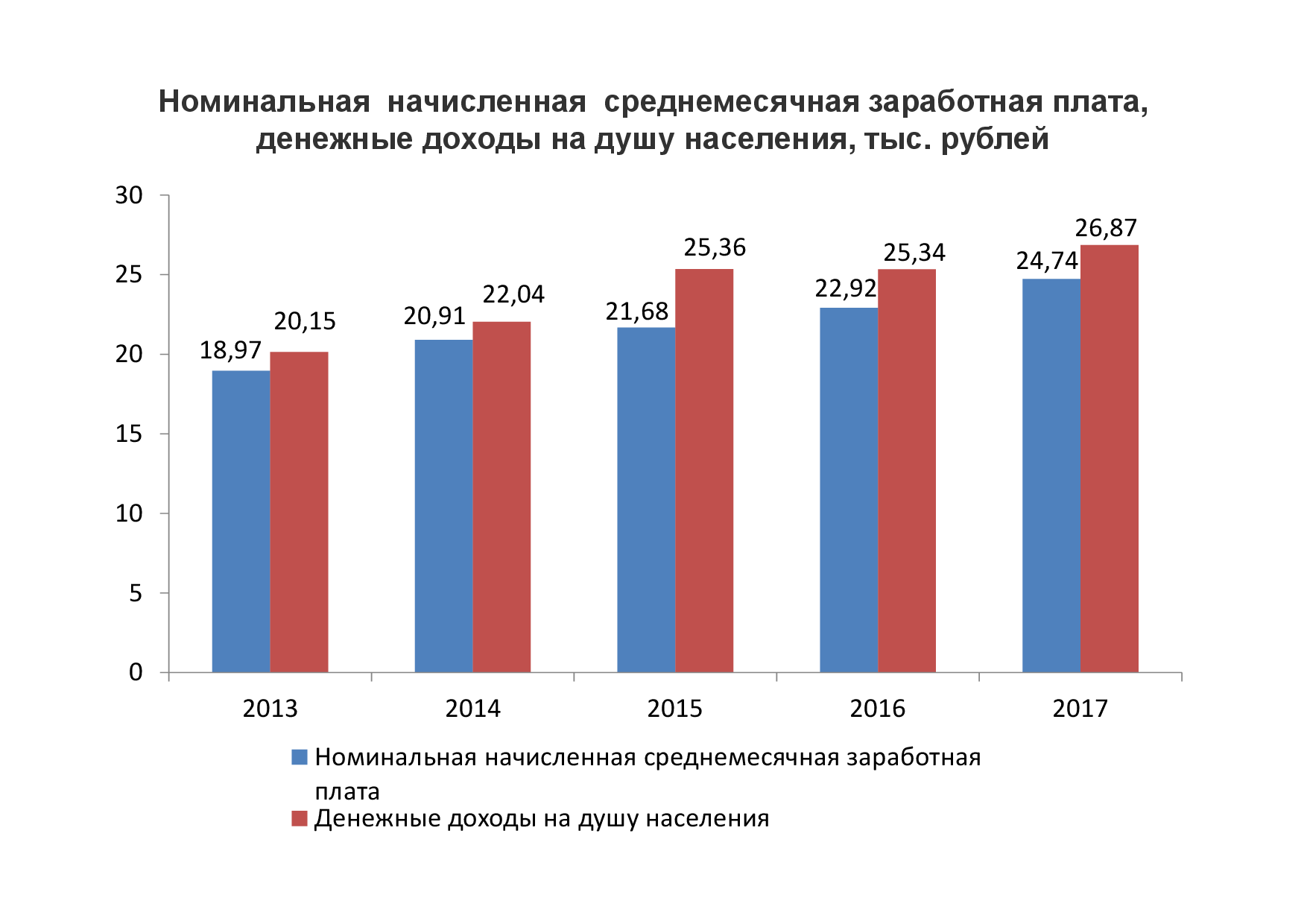 Номинальная начисленная среднемесячная заработная плата за 2017 год увеличилась на 6,0 процентов к уровню 2016 года и составила 24389,9 рубля.