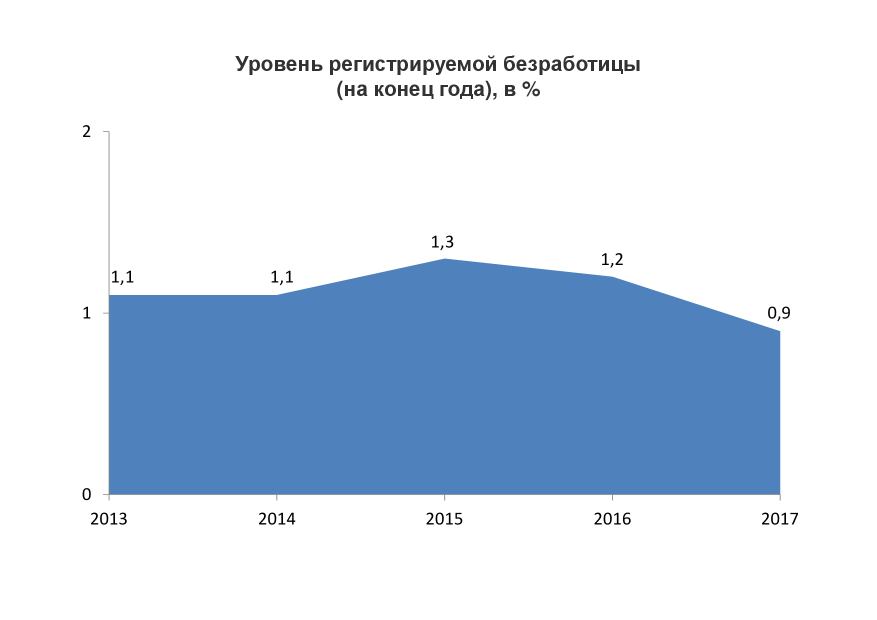 Численность официально зарегистрированных безработных за 2017 год уменьшилась на 1752 человека и составила на 1 января 2018 года 5,6 тыс. человек (на 1 января 2017 года – 7,4 тыс. человек). Уровень официально регистрируемой безработицы составил 0,9 процента к численности экономически активного населения (на 1 января 2017 года – 1,2 процента).