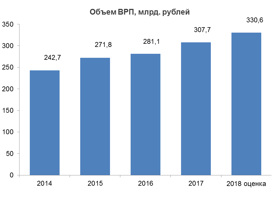 Объем валового регионального продукта в 2017 году составил 307,7 млрд. рублей, индекс физического объема ВРП - 104,7 процента к уровню 2016 года. В 2018 году объем ВРП оценивается в 330,6 млрд. рублей (101,2 процента к уровню 2017 года).