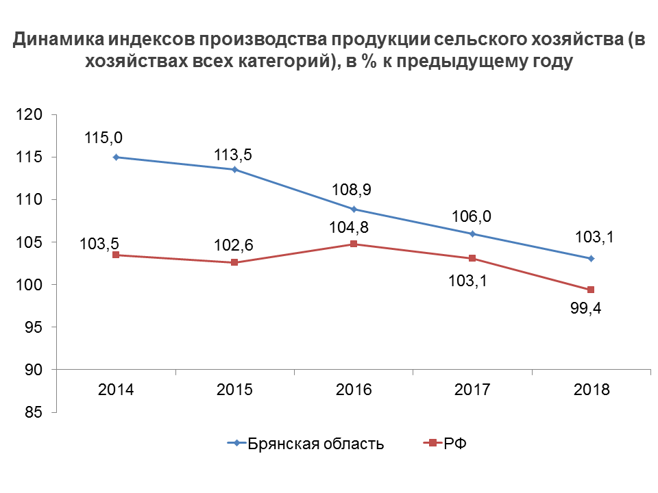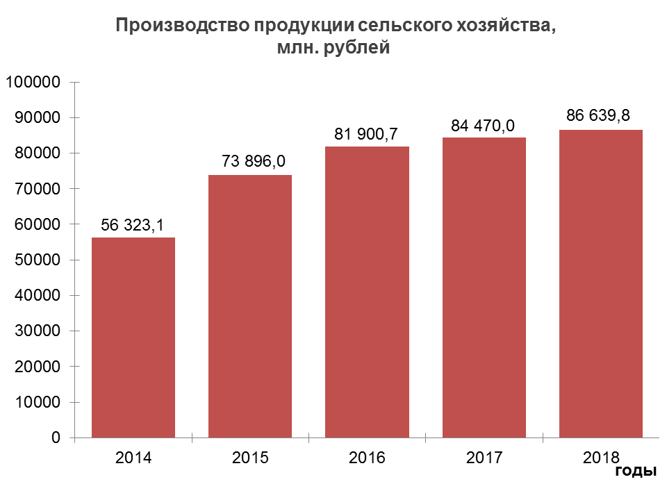 В 2018 году объем производства продукции сельского хозяйства во всех категориях хозяйств составил 86,6 млрд. рублей или 103,1 процента в сопоставимых ценах к уровню 2017 года, в том числе продукции растениеводства – 35,2 млрд. рублей (102,5 процента), продукции животноводства – 51,4 млрд. рублей (103,4 процента).