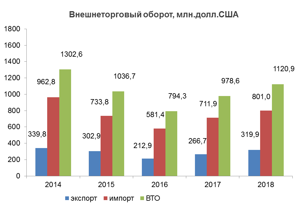 Внешнеторговый оборот области в 2018 году составил 1120,9 млн. долларов США (114,5 процента к уровню 2017 года), в том числе экспорт – 319,9 млн. долларов США (120,0 процентов), импорт – 801,0 млн. долларов США (112,5 процента).