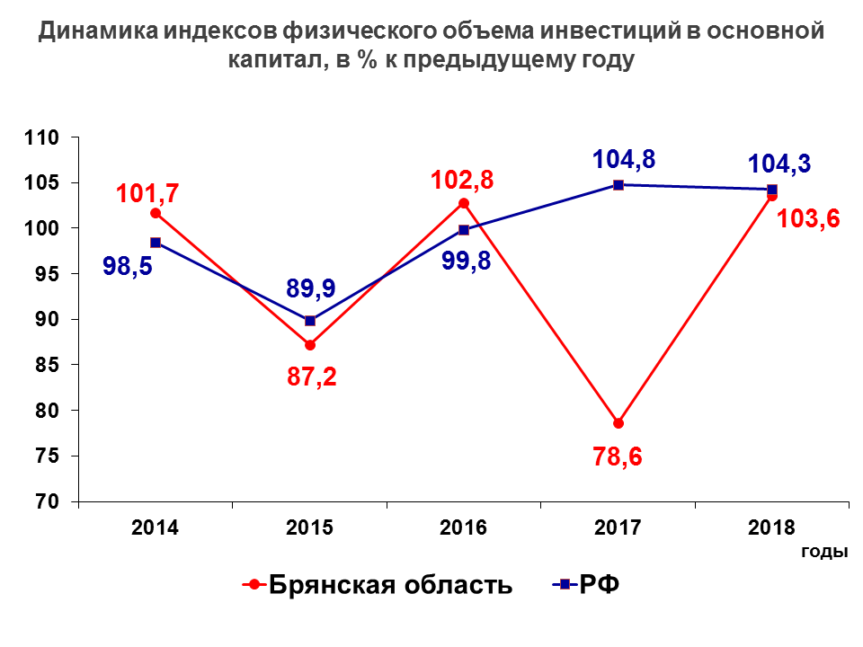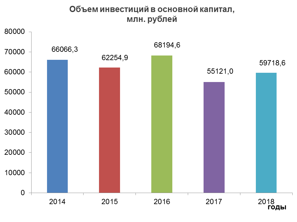 Объем инвестиций в основной капитал за счет всех источников финансирования в 2018 году составил 59,7 млрд. рублей или 103,6 процента к уровню 2017 года в сопоставимых ценах.