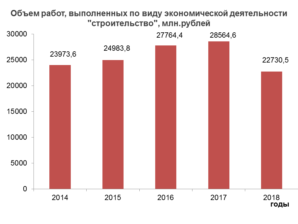Объем работ, выполненных по виду деятельности «строительство», в 2018 году составил 22,7 млрд. рублей или 73,1 процента к уровню 2017 года (в сопоставимых ценах).