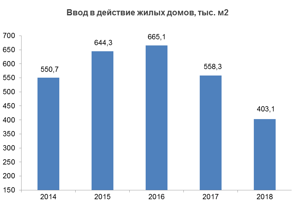 Введено в эксплуатацию 403,1 тыс. кв. метров общей площади жилых домов или 72,2 процента к уровню 2017 года.