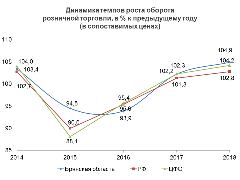Оборот розничной торговли за 2018 год составил 253,2 млрд. рублей, что на 4,9 процента больше, чем за 2017 год (в сопоставимых ценах). В структуре оборота розничной торговли доля продовольственных товаров составила 45,3 процента, непродовольственных – 54,7 процента.