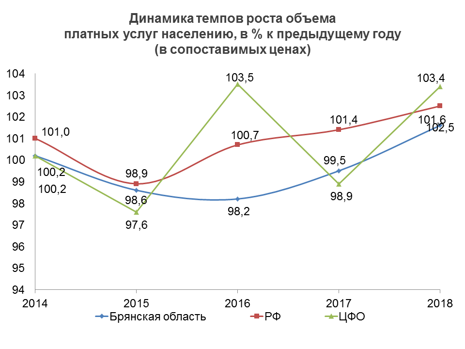 В 2018 году населению было оказано платных услуг на 53,2 млрд. рублей, что на 1,6 процента больше, чем за 2017 год (в сопоставимых ценах). На долю юридических лиц (кроме субъектов малого предпринимательства, средняя численность работников которых превышает 15 человек), приходилось 53,8 процента всех оказанных платных услуг в области.