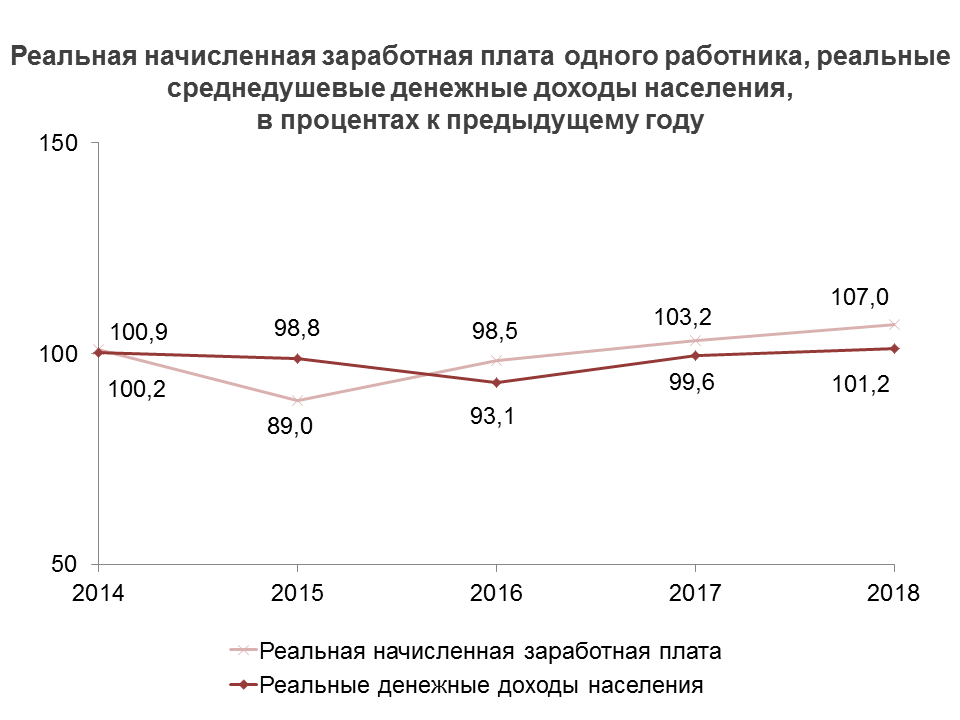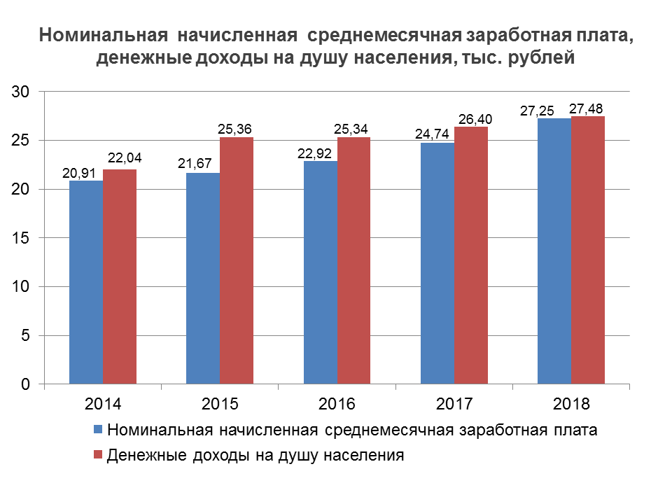 Среднедушевые денежные доходы в среднем за год сложились в сумме 27488,1 рубля (больше на 4,1 процента), реальные среднедушевые денежные доходы населения составили 101,2 процента к уровню 2017 года.