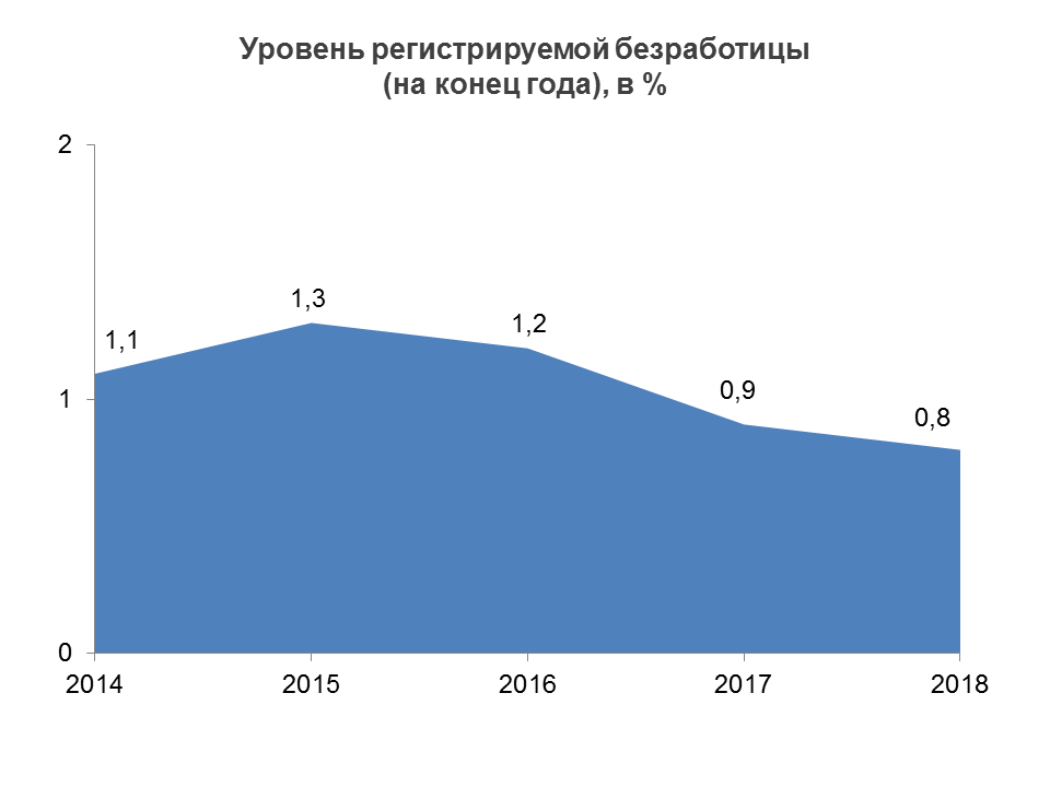 Численность официально зарегистрированных безработных на 1 января 2019 года 4,7 тыс. человек (на 1 января 2018 года – 5,6 тыс. человек). Уровень официально регистрируемой безработицы составил 0,8 процента к численности экономически активного населения (на 1 января 2018 года – 0,9 процента).