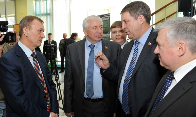 Перед началом пленарного заседания Губернатор Николай Денин, вице-губернатор, курирующий АПК региона, Александр Касацкий, заместитель департамента растениеводства, химизации и средств защиты растений Министерства сельского хозяйства РФ Денис Паспеков и ректор вуза Николай Белоус возложили цветы к мемориалу в память воинов-интернационалистов и жителей с. Кокино, погибших в годы Великой Отечественной войны. Затем осмотрели выставку-презентацию предприятий и организаций.