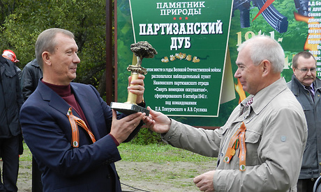 Затем московские гости вручили главе нашего региона Диплом Совета по сохранению природного наследия при Совете Федерации РФ, сертификат, подтверждающий признание дерева всероссийским памятником природы, переходящий символ эстафеты и памятную доску.