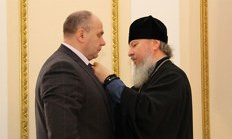 Затем Митрополит Брянский и Севский Александр вручил Медаль Преподобного Олега Брянского заместителю председателя Брянской областной Думы Анатолию Бугаеву за восстановление храма.