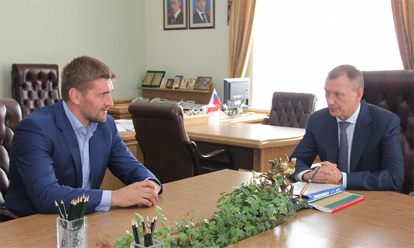 Строительство в Брянске Дворца самбо и вопросы популяризации здорового образа жизни обсудили сегодня Губернатор Николай Денин и четырехкратный чемпион мира по самбо Виталий Минаков.
