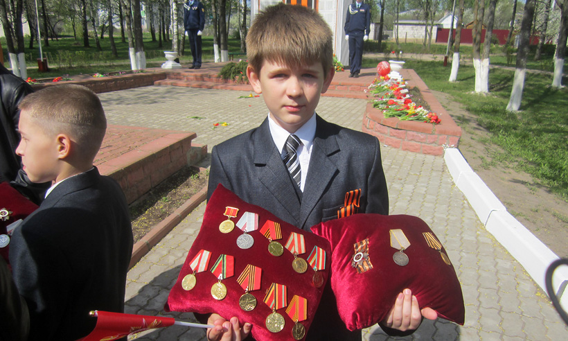 Недалеко от Вадима его сверстник Артем Диченков бережно держал в руках подушечки алого цвета с боевыми наградами. Его прадедушка Иван Васильевич Шамарин в 1943-м был тяжело ранен снайпером и попал в госпиталь. А на родину командование отправило «похоронку». Но выжил солдат, вернулся домой с победой. Еще один прадедушка, Николай Семенович Веснянкин, за проявленное мужество и героизм награжден орденами Славы 2-й и 3-й степеней, медалью «За отвагу». «В нашей семье принято чтить память о тех, кто защищал Родину, — рассказал Артем. — Каждый год ездим в Трубчевск на могилку захороненных родственников».