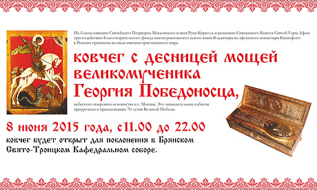 8 июня 2015 года с 11.00 до 22.00 в Брянский Свято-Троицкий Кафедральный собор будет принесен ковчег мощей с десницей святого великомученика Георгия Победоносца.