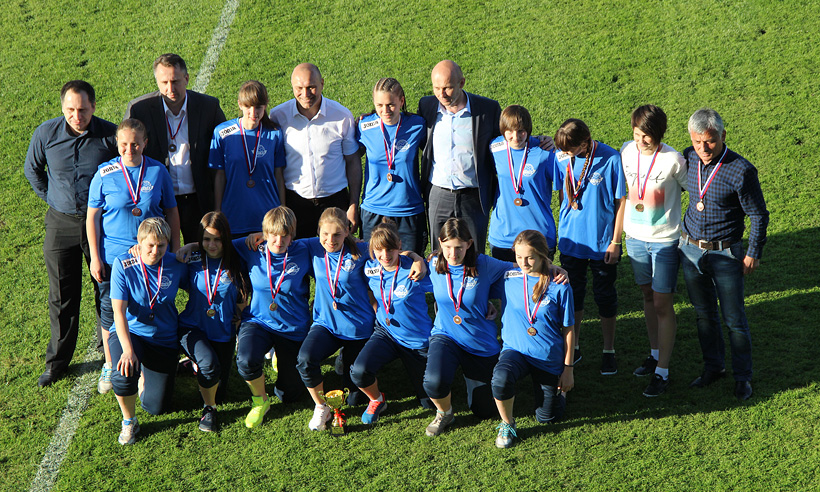 В перерыве матча заместитель Губернатора Александр Коробко поздравил женскую футбольную команду «Триумф» (город Фокино), завоевавшую бронзовую медаль в первенстве МОА «Черноземье».