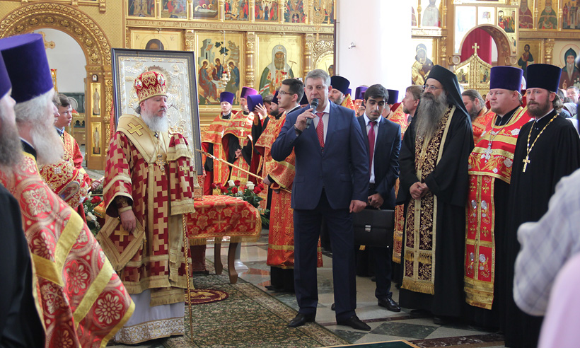 — В годы Великой Отечественной войны наши земляки храбро сражались на фронтах, в партизанских отрядах, трудились в тылу, на фабриках и заводах. Их самоотверженность, героизм и патриотизм способствовали тому, что нашему городу было присвоено звание «Город Воинской славы». То, что ковчег с частицей мощей святого Георгия, покровителя воинства, прибыли на нашу Брянскую землю — символично. И я хочу сказать спасибо Святейшему Патриарху Кириллу и нашим гостям с Афона за то, что сегодня каждый может прийти и поклониться одной из главных христианских святынь.
