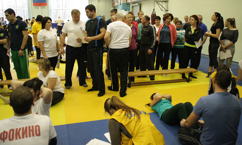 Муниципальным служащим было предложено испытать свои возможности по сдаче нормативов комплекса «ГТО»: прыжок в длину с места толчком двумя ногами, отжимание, наклон вперед из положения сидя, поднимание туловища из положения лежа на спине, подтягивание на высокой перекладине.