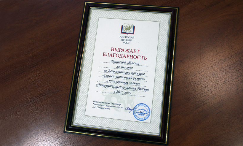 Также Сергей Степашин вручил Александру Богомазу благодарность за активное участие области во всероссийском конкурсе «Самый читающий регион». Фондом отмечено участие области в выездных выставках 2015 года: организованной в Государственной Думе РФ экспозиции «Год литературы в России: парламентские страницы» и «Книжном форуме» в Брянске. Также отмечены успехи региона в повышении доступности чтения. По итогам Года литературы Брянщина удостоена звания «Литературный флагман России».