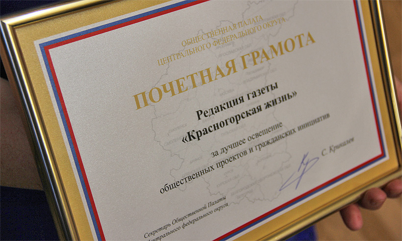 В Москве, в рамках совместного заседания Совета при полномочном представителе Президента Российской Федерации в Центральном федеральном округе и Общественной палаты ЦФО состоялось подведение итогов и торжественное награждение победителей конкурса Общественной палаты Центрального федерального округа среди средств массовой информации на лучшее освещение общественных проектов и гражданских инициатив. К участию в конкурсе были представлены 282 проекта из 86 средств массовой информации регионов ЦФО. Награды были присуждены в пяти номинациях: «Печатное СМИ», «ТВ», «Интернет-СМИ», «Большой проект маленького СМИ» и «Великая Победа».