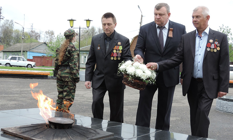Глава администрации Александр Чебыкин и ликвидаторы Николай Дорохов и Николай Цуренков возложили цветы к мемориалу «Память».