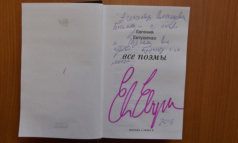 В завершение Евгений Евтушенко подарил участникам встречи свою книгу «Все поэмы» с дарственной надписью.
