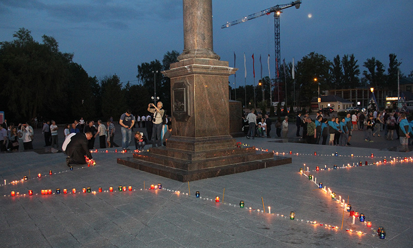 У подножия стелы Воинской славы участники акции выложили из свечей контур «Звезды памяти». Наши земляки зажгли лампадки со свечами в память о своих отцах, дедах и прадедах, принимавших участие в Великой Отечественной войне, внеся частичку своих воспоминаний в свет неугасаемой «Звезды памяти».