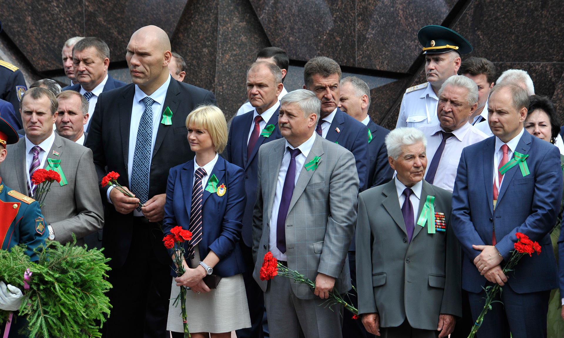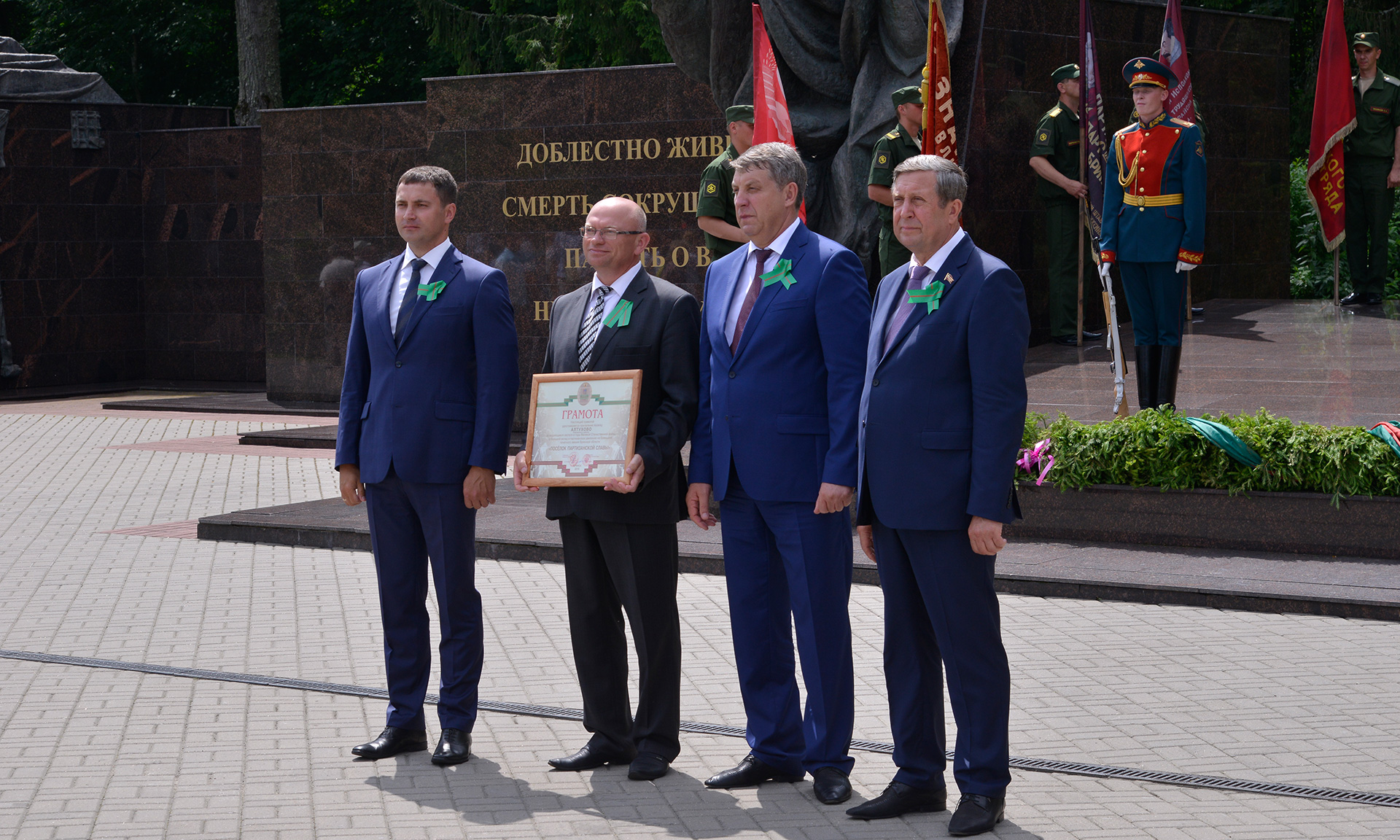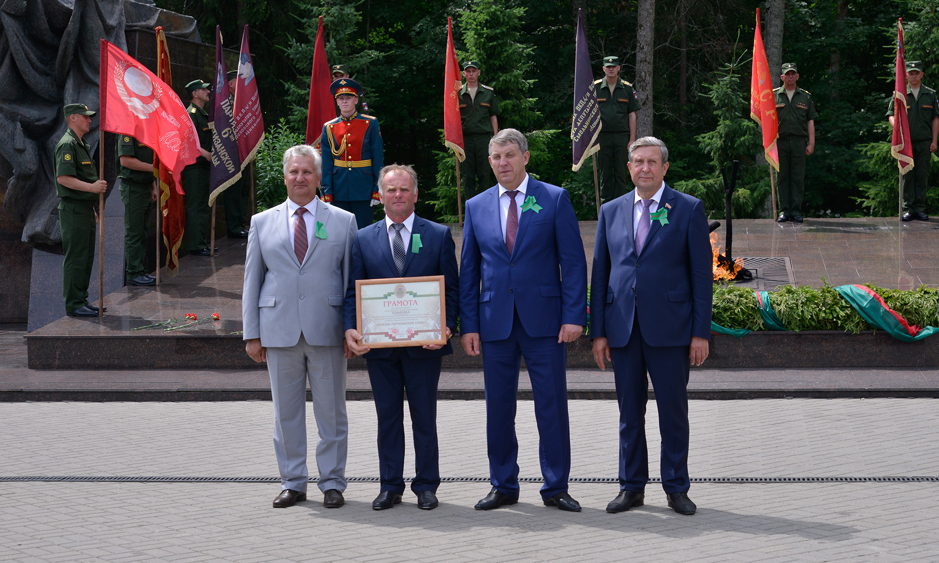 В знак памяти и благодарности за беспримерный подвиг партизан и подпольщиков, отдавших жизнь в борьбе с немецко-фашистскими захватчиками, к Вечному Огню военнослужащие роты Почетного караула возложили гирлянду Славы, руководители и гости — цветы.