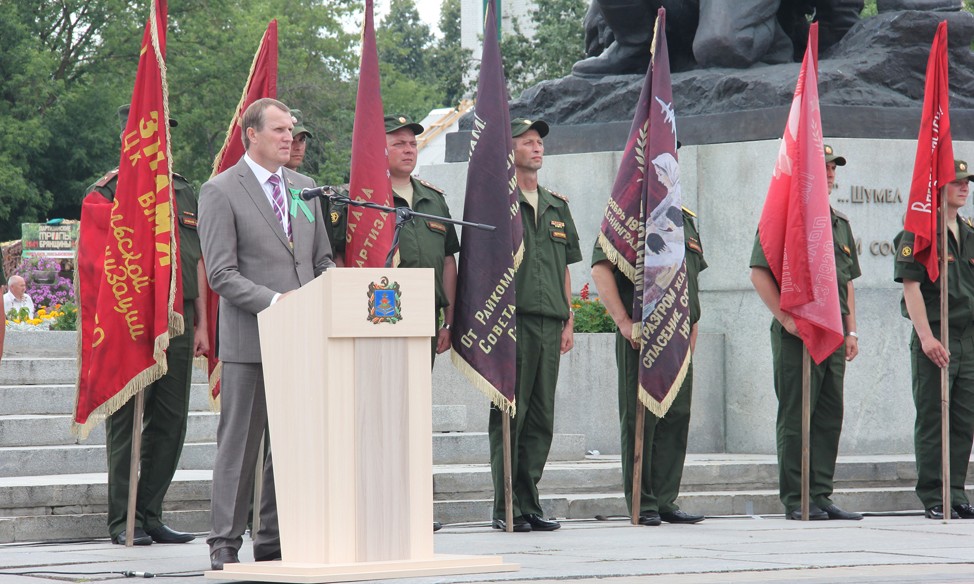 — Сегодня мы, стоя под овеянными ратной славой партизанскими знаменами рядом со священным для каждого жителя Брянщины Вечным огнем Памяти, отдаем дань уважения подвигу партизан и подпольщиков, внесшим весомый вклад в победу советского народа в Великой Отечественной войне. Символично, что вместе с жителями Брянской области на площади партизанской славы присутствуют представители бывших республик Советского Союза, в которых, как и на Брянщине, в годы войны было развернуто массовое партизанское движение. Партизаны и подпольщики активно боролись с врагом на оккупированной территории России, Белоруссии, Украины, Молдавии, Прибалтики. Опаленная народным гневом земля горела под ногами захватчиков. К 1943 году в партизанских отрядах на Брянщине сражались свыше 60 тысяч человек, сковывая значительные силы противника и разрушая его коммуникации.