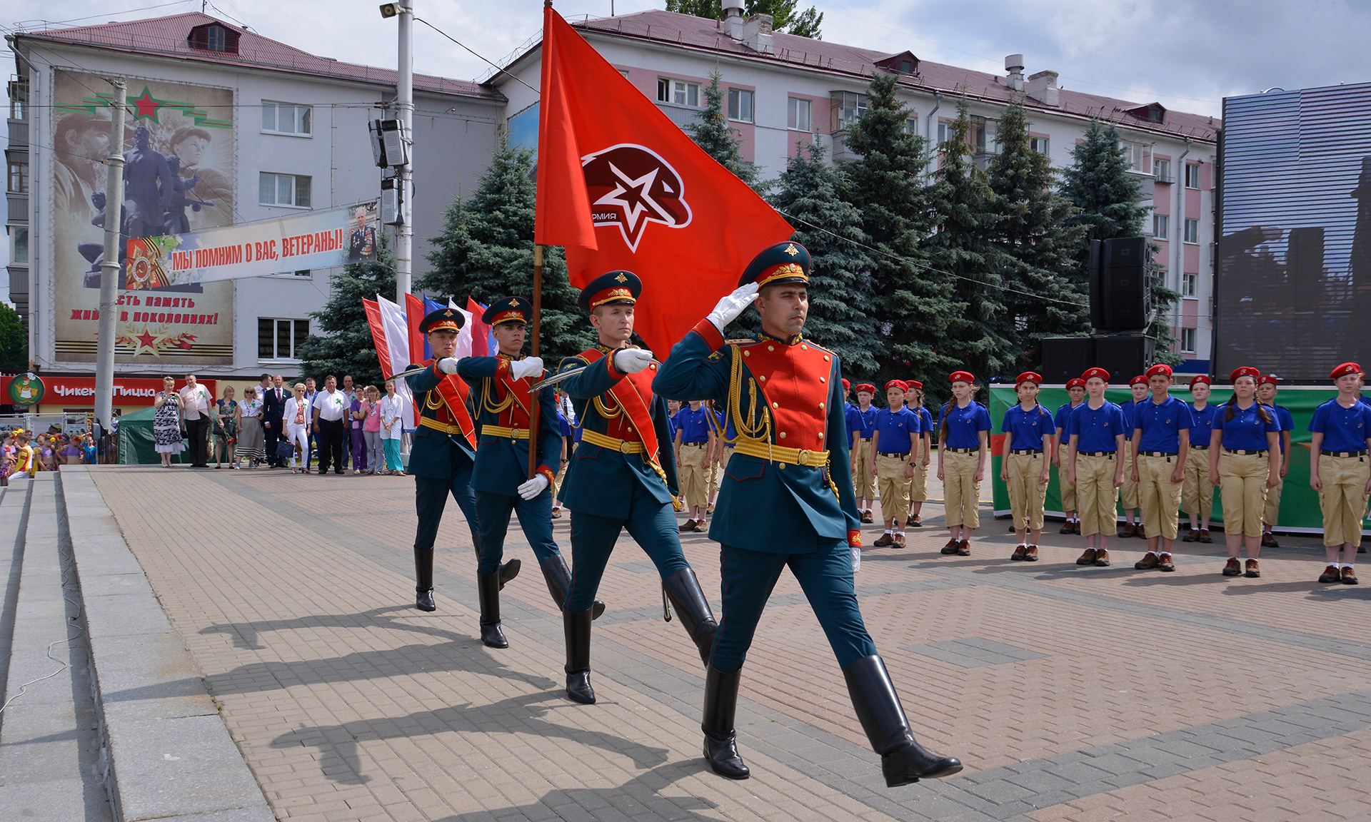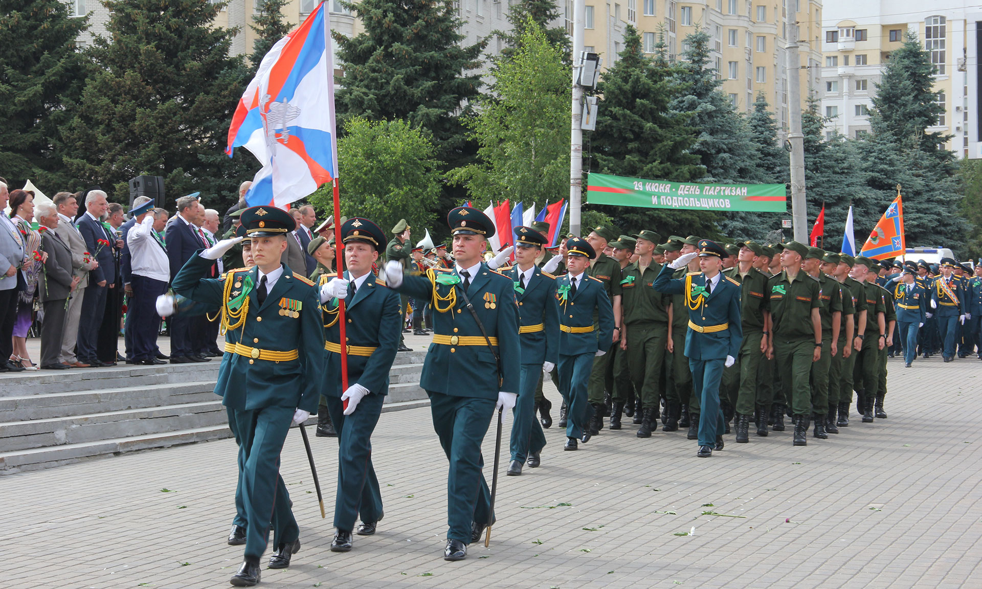 На площадь Партизан внесли копию Знамени Победы и государственный флаг Российской Федерации. 6200 партизанских отрядов, бригад и соединений добывали победу на всей территории нашей страны. И каждый имел свое красное знамя — символ мужества и непокоренности врагу. На площадь Партизан вынесли знамена партизанских отрядов России, Белоруссии, Украины. Участники партизанского движения встали под свои боевые знамена: