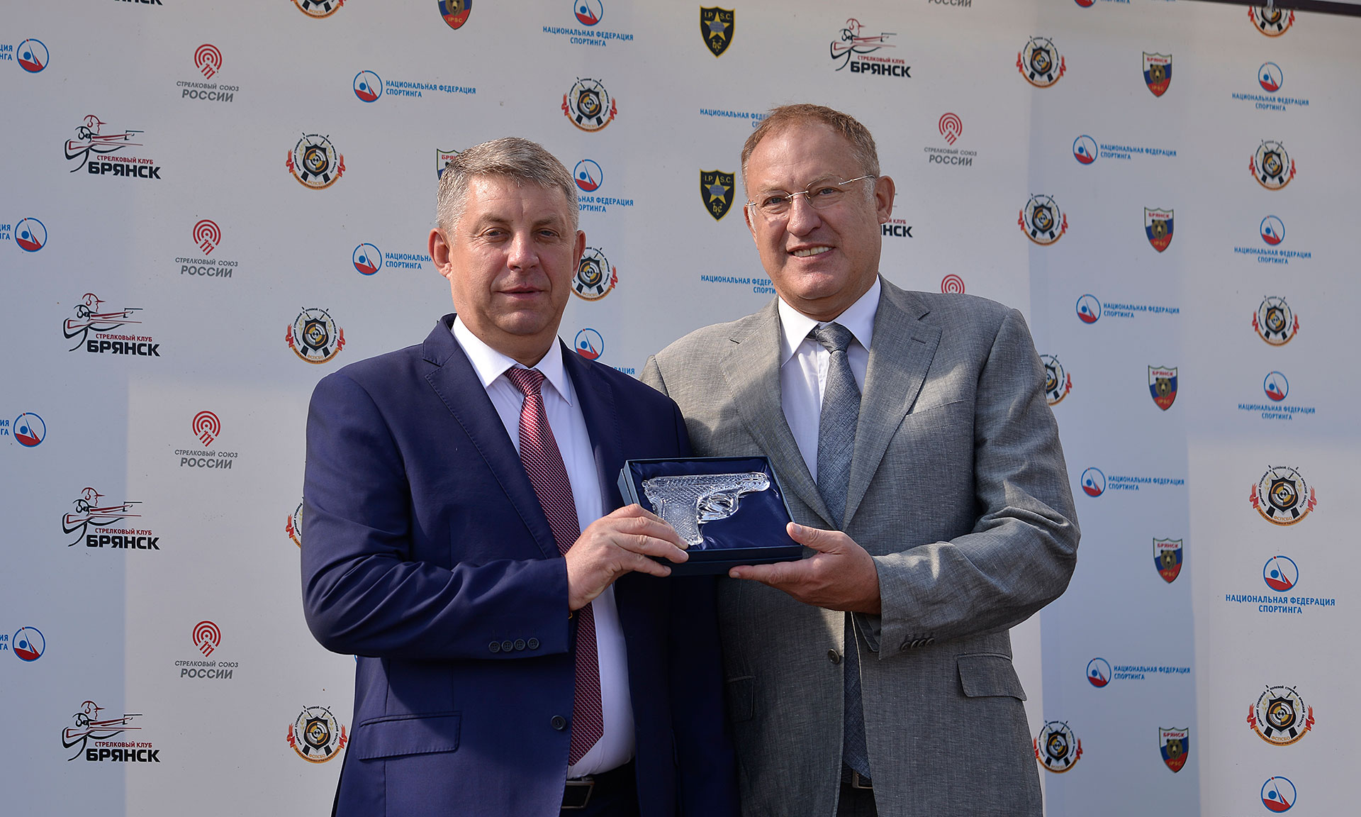 В память о чемпионате и гостеприимной брянской земле Георгию Бурцеву Губернатор вручил символичный подарок — хрустальный пистолет.