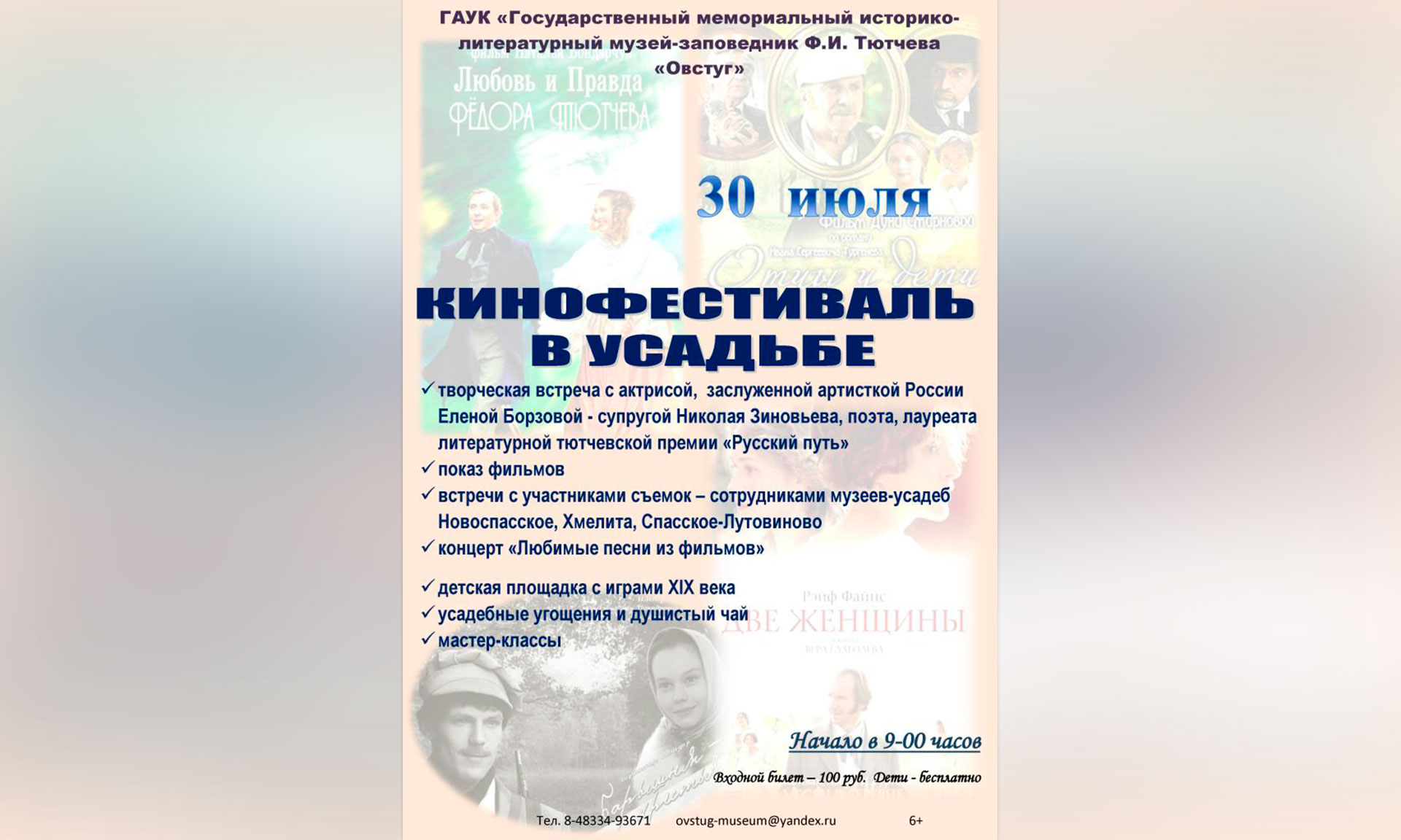 30 июля 2016 года Государственный мемориальный историко-литературный музей-заповедник Ф. И. Тютчева «Овстуг» приглашает гостей и жителей Брянской области принять участие в празднике «Кинофестиваль в усадьбе», посвященном Году российского кино.