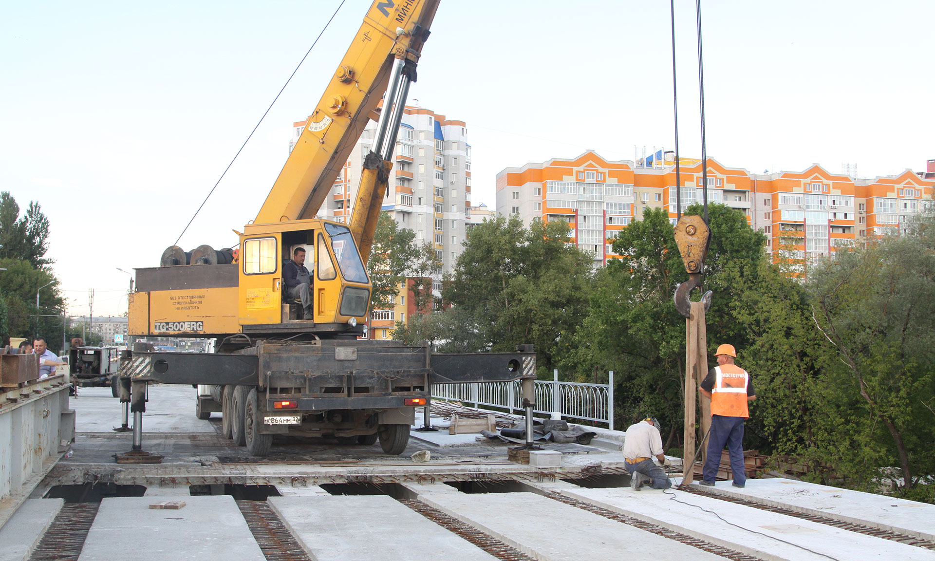 Последняя балка десятого пролетного строения уложена в среду вечером на Первомайском мосту. Заместитель Губернатора Брянской области Юрий Мокренко, глава Брянской городской администрации Александр Макаров и глава города Александр Хлиманков выразили благодарность мостостроителям за работу, которую они ведут хорошими темпами с опережением графика.