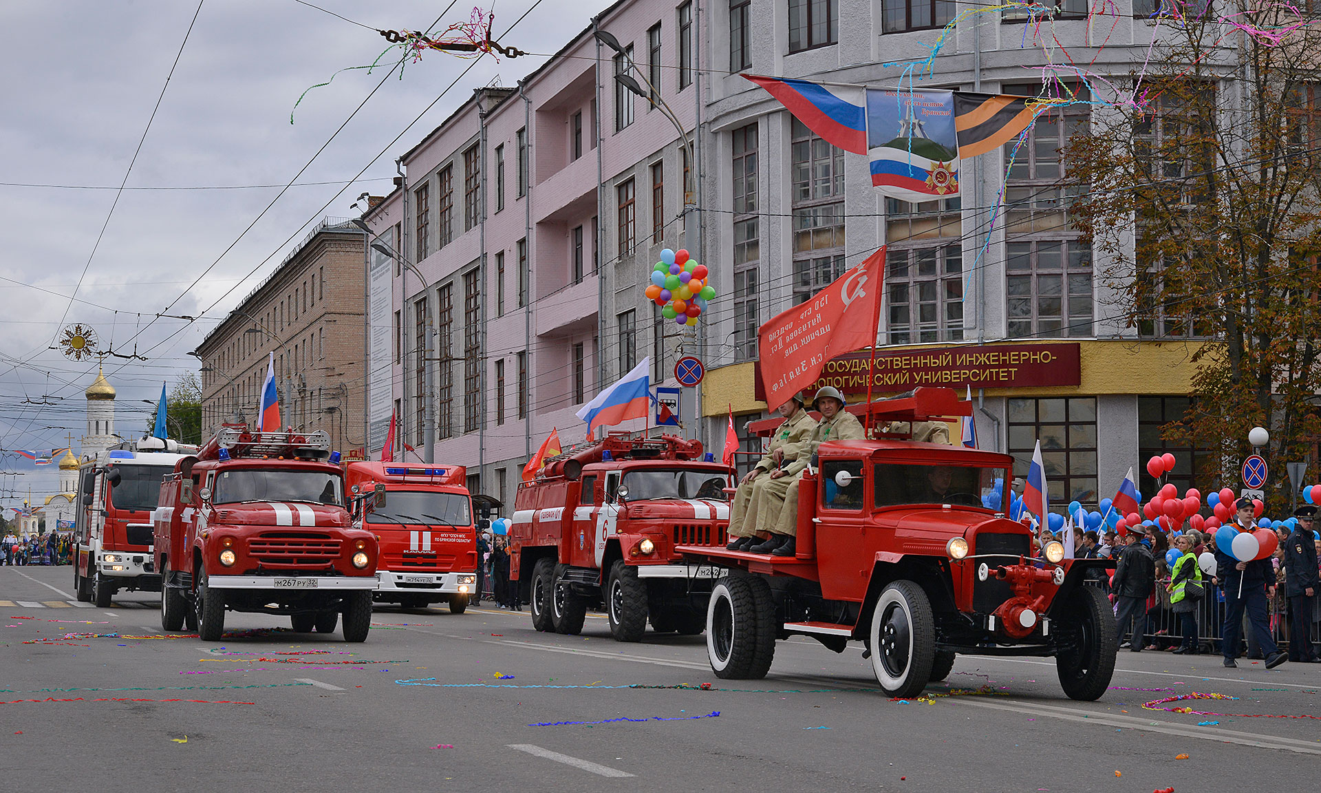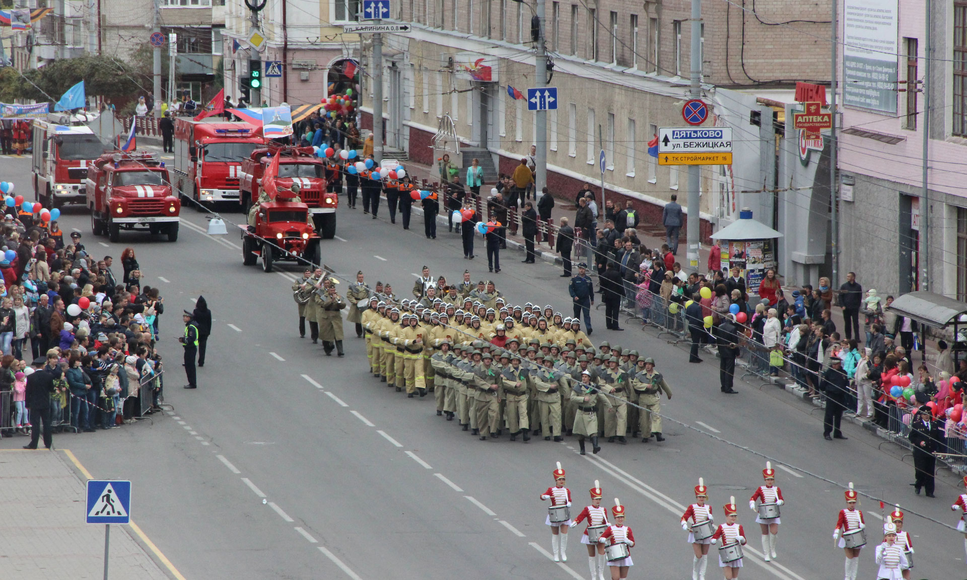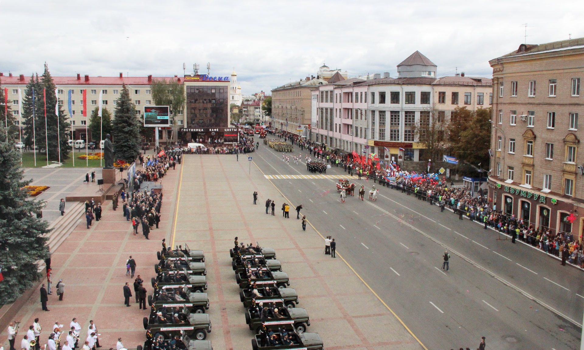 В праздничном строю — представители предприятий и организаций, творческих коллективов, юнармейцы, жители и гости города, делегации Республики Беларусь, Республики Сербия, Республики Польша, Латвийской республики, Литовской республики, автономного территориального образования «Гагаузия» Республики Молдова, делегации городов Орла и Тулы.