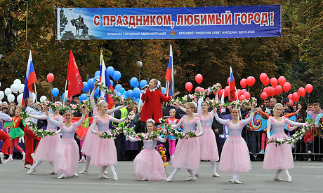 Участники праздничной колонны направляются к площади Партизан, где состоится торжественный митинг «В Брянском лесу тишина», посвященный 73-й годовщине освобождения Брянской области от немецко-фашистских захватчиков и Дню города Брянска.
