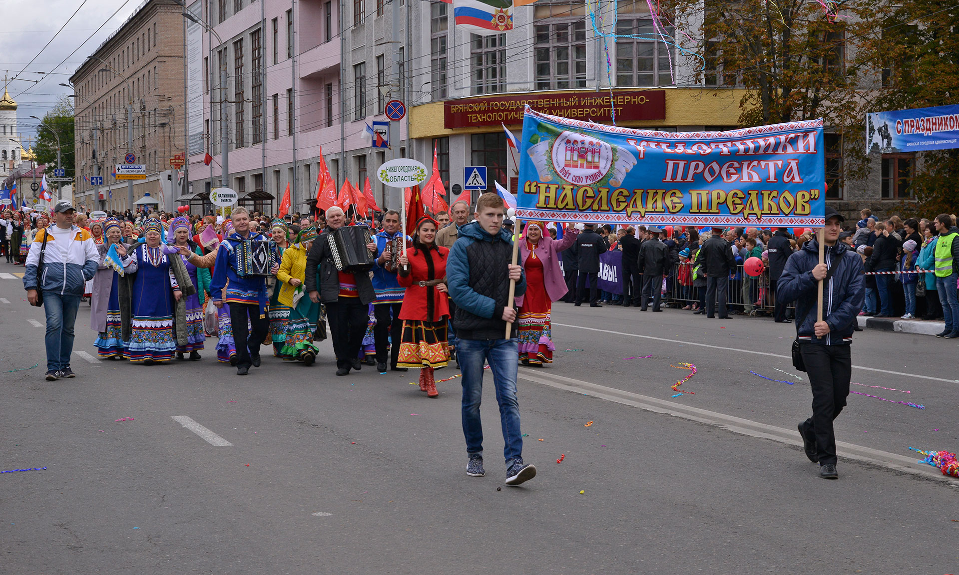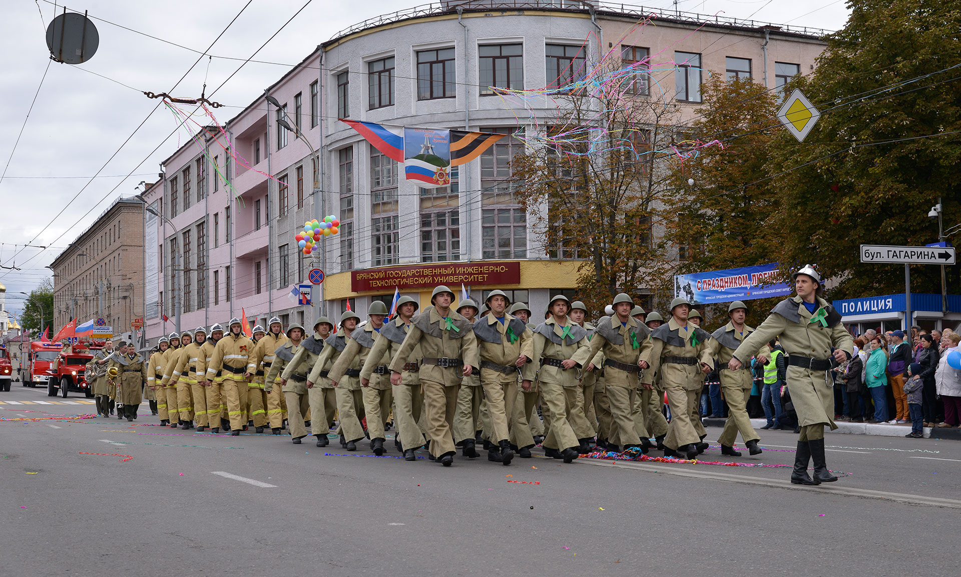Возглавляют торжественную колонну ветераны на автомобилях УАЗ. В праздничном шествии — Герои России, Советского Союза и Социалистического труда, личный состав воинских частей и подразделений Брянского гарнизона, силовых ведомств, представители территориальных органов государственной власти Брянской области. Несколько поколений соединились в один строй — поколение победителей, поколение Героев Отечества и молодое поколение: школьники и студенты, которые с гордостью приветствуют и равняются на этих людей!