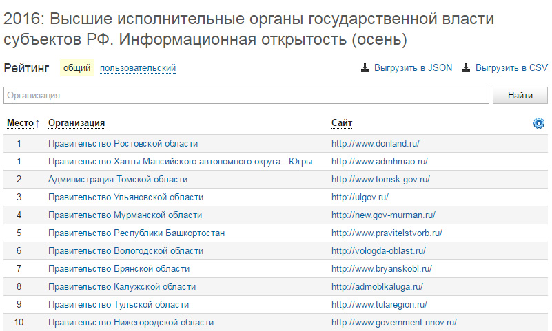 На основе результатов мониторинга формируются рейтинги информационной открытости официальных сайтов федеральных органов исполнительной власти РФ, законодательных органов государственной власти субъектов РФ, исполнительных органов государственной власти субъектов РФ, судов Российской Федерации.