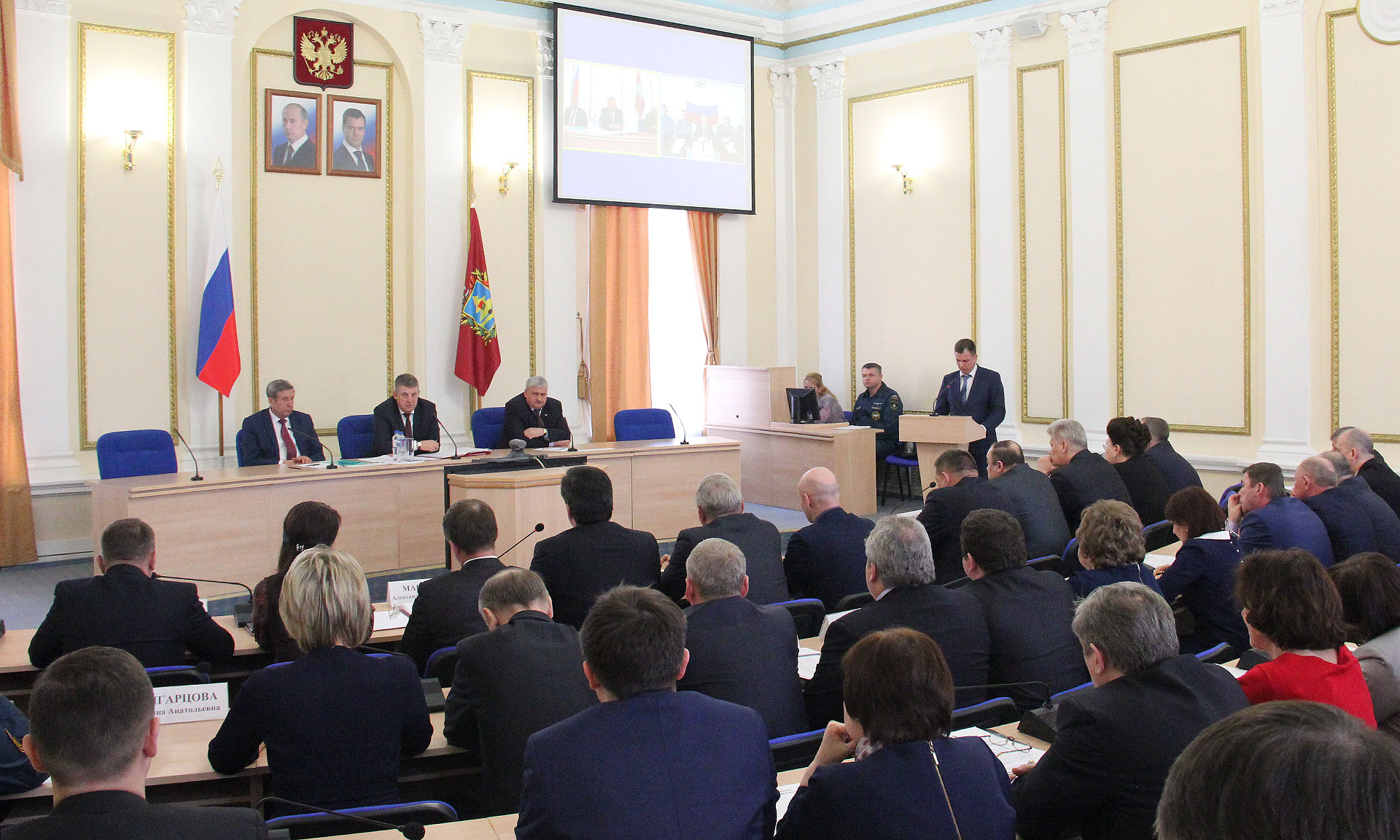 В оперативном совещании приняли участие председатель Брянской областной Думы Владимир Попков, главный федеральный инспектор по Брянской области Леонид Соломатин.