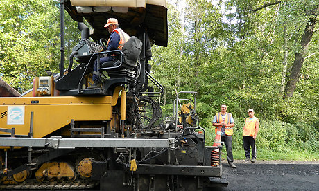 На ремонте автодороги задействовано пять автомашин МАЗ (на подвозке асфальта и грунта), один асфальтоукладчик, три асфальтоукатчика, автоцистерна для подвоза воды, автобус для доставки бригады из шести человек к месту работы. Стоит отметить, что работы ведутся быстрыми темпами, к десяти часам утра уже было уложено пять машин асфальта.