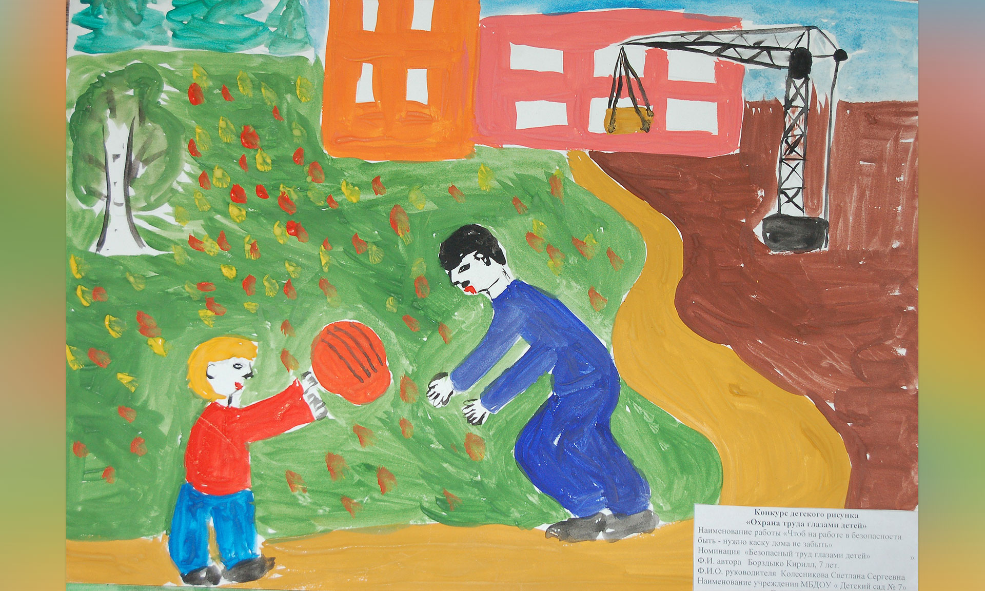 Боздыко Кирилл, 7 лет, воспитанник МБДОУ Детский сад № 7 общеразвивающего вида с приоритетным осуществлением деятельности по социально-личностному ориентированию детей» г. Новозыбкова, творческая работа «Чтоб на работе в безопасности быть — нужно каску дома не забыть», воспитатель Колесникова Светлана Сергеевна