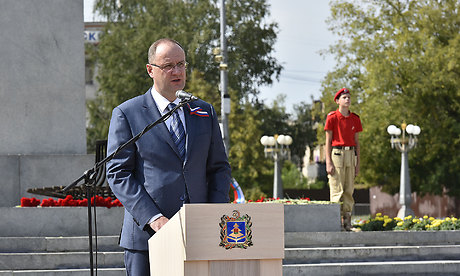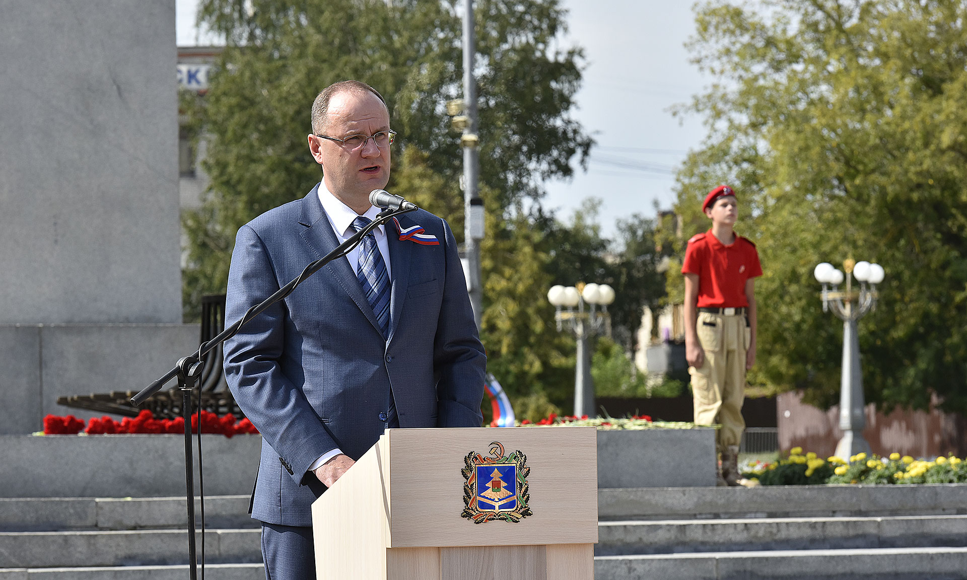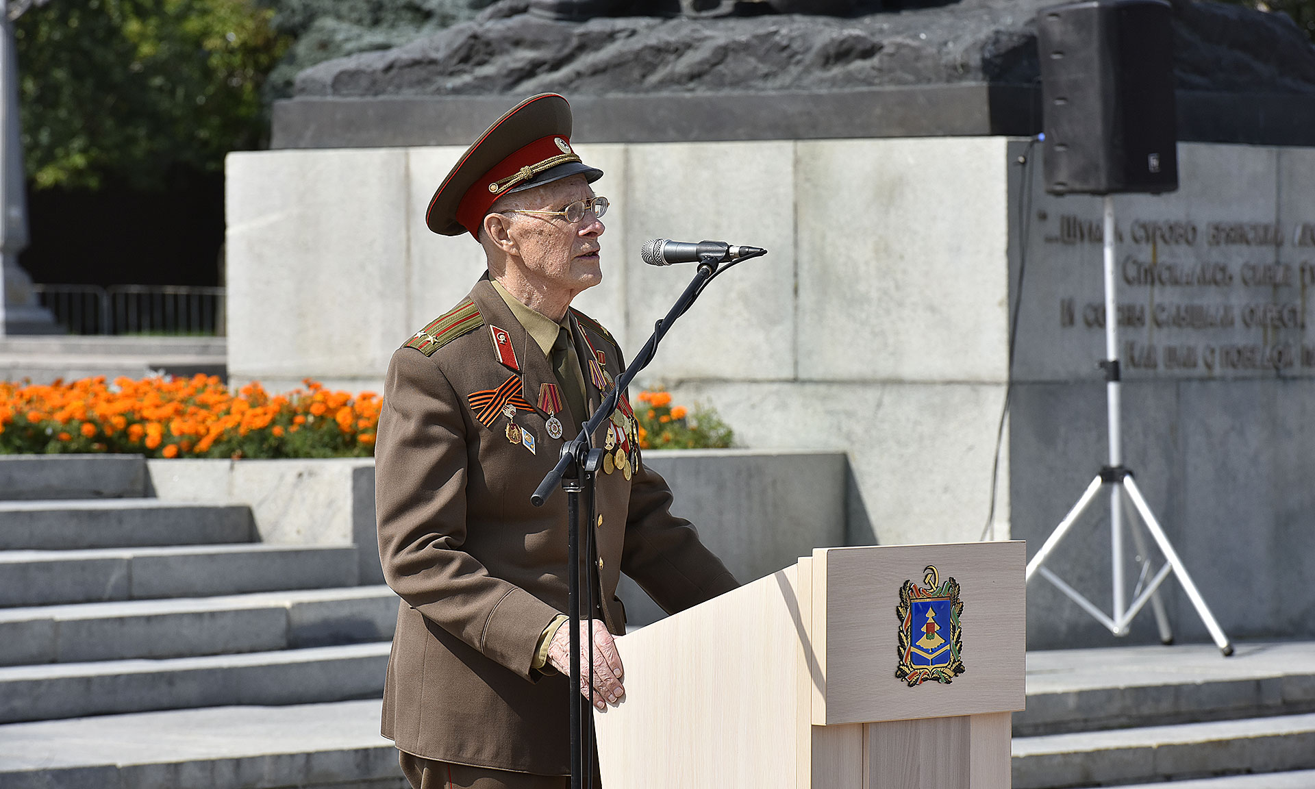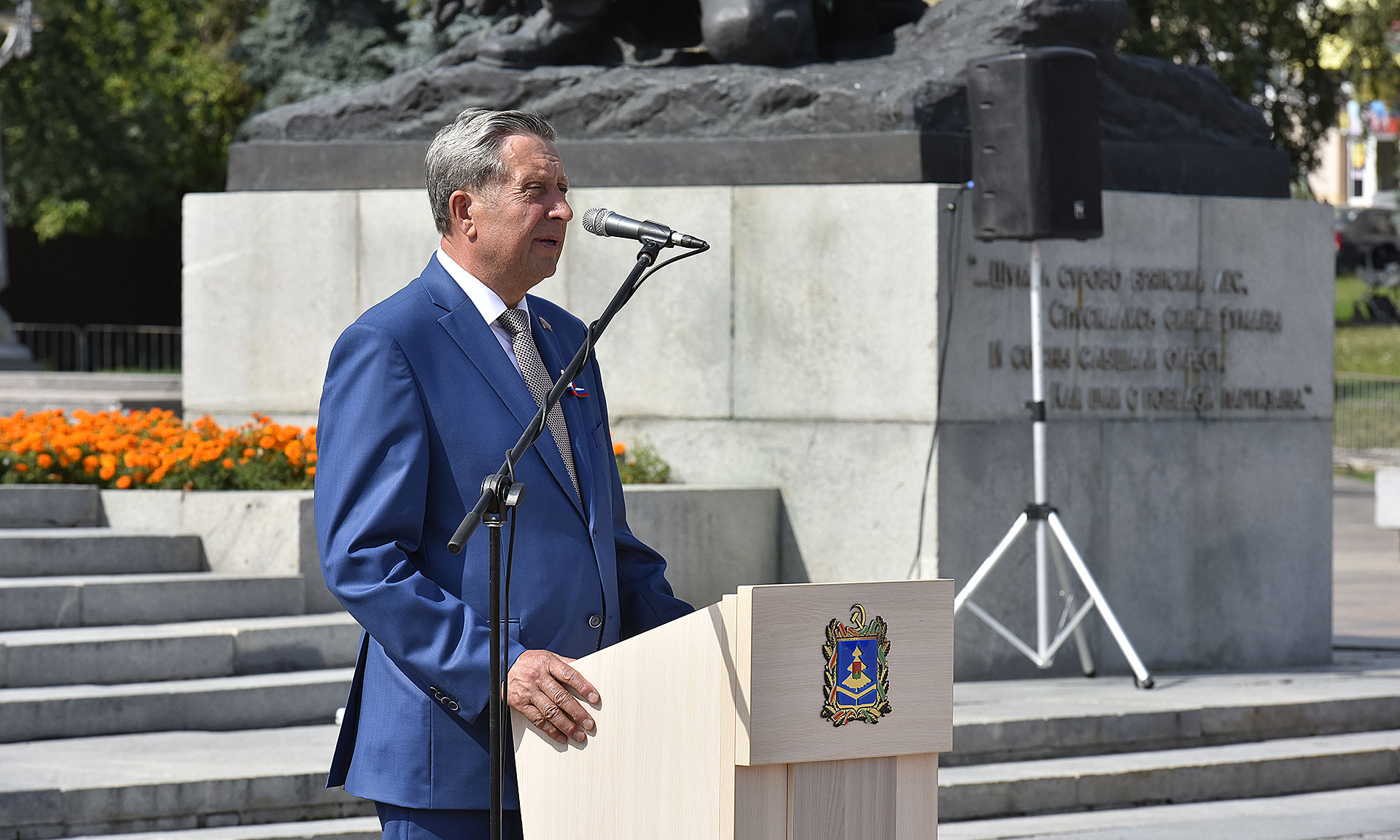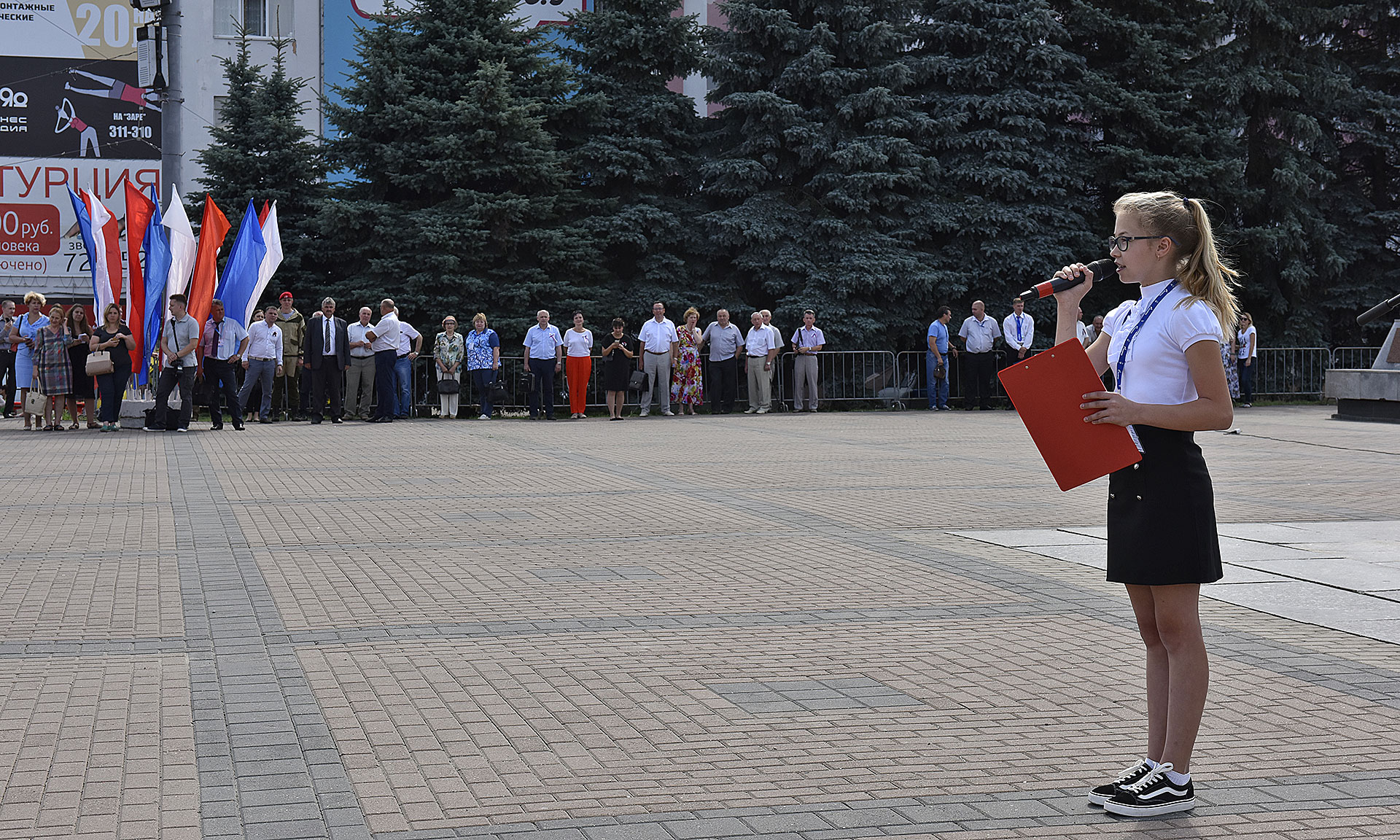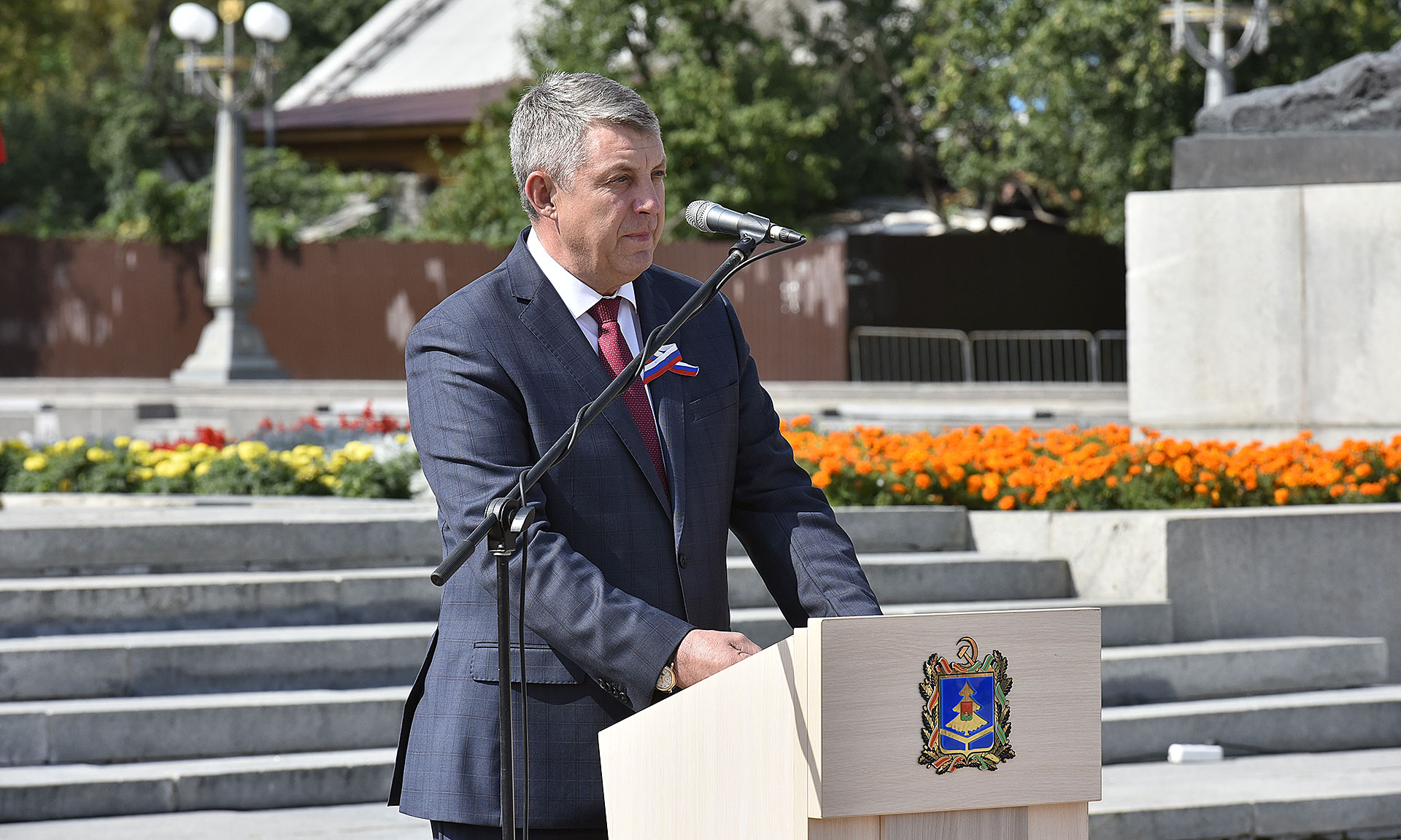 — Дорогие друзья! От всей души поздравляю вас с этим знаменательным праздником! В годы гражданской и Великой Отечественной войны главным заслуженным орденом был Орден Боевого Красного Знамени, а в мирные дни — Орден Трудового Красного Знамени. В годы Великой Отечественной войны существовал закон: если часть теряла свое знамя, эта часть подлежала немедленному расформированию. Но если из боя выходил один из раненых бойцов, грудь которого была обернута полковым знаменем, эта часть немедленно восстанавливалась лучшими бойцами нашей армии. Дорогие друзья! Меняются люди, события, но мы всегда ценим российский флаг, который развевается от сельского совета до Государственной Думы, и сейчас он реет на площади Партизан города Брянска, города боевой, трудовой, воинской и партизанской славы! С праздником, друзья!