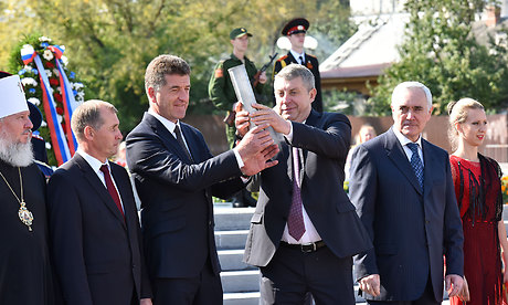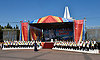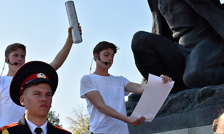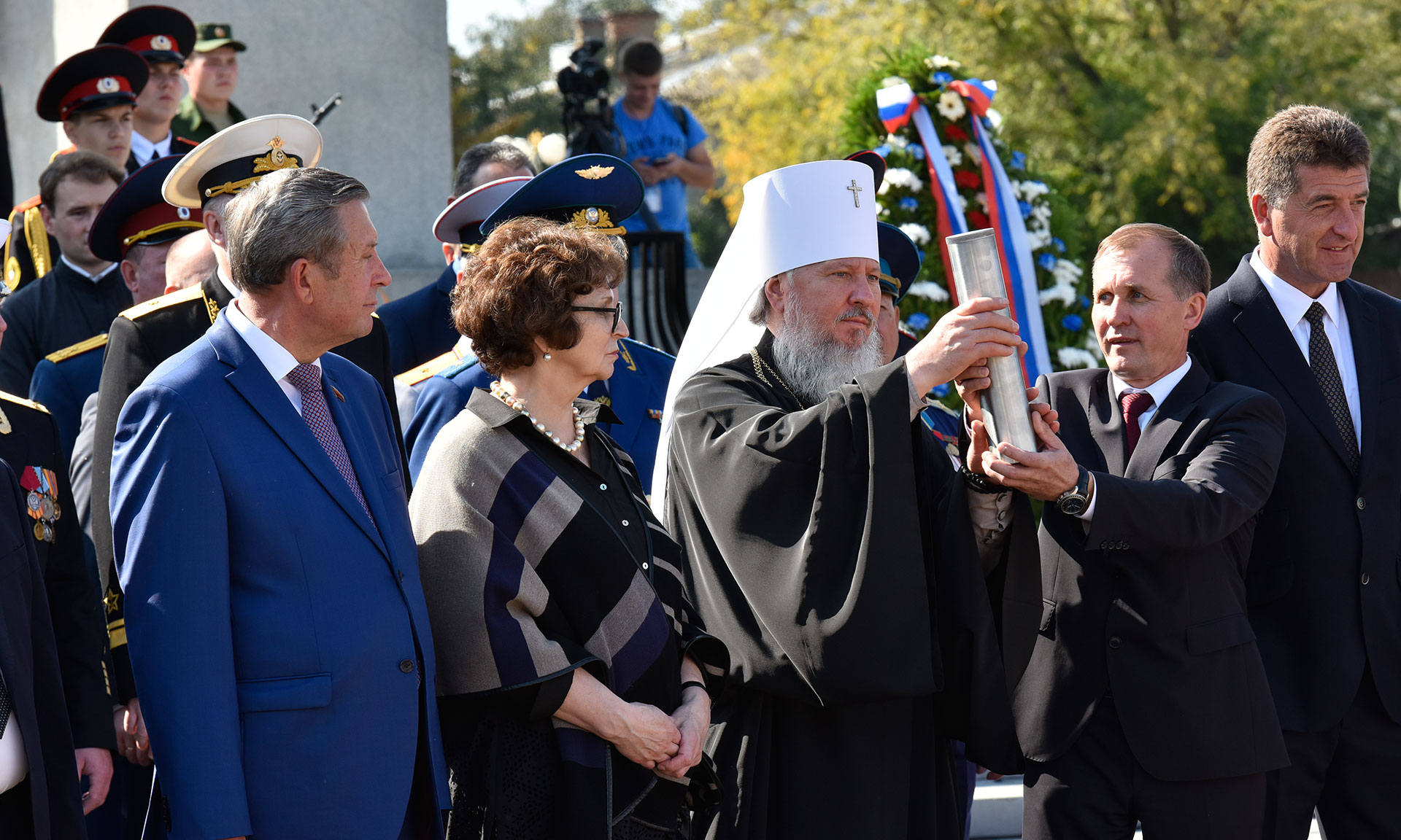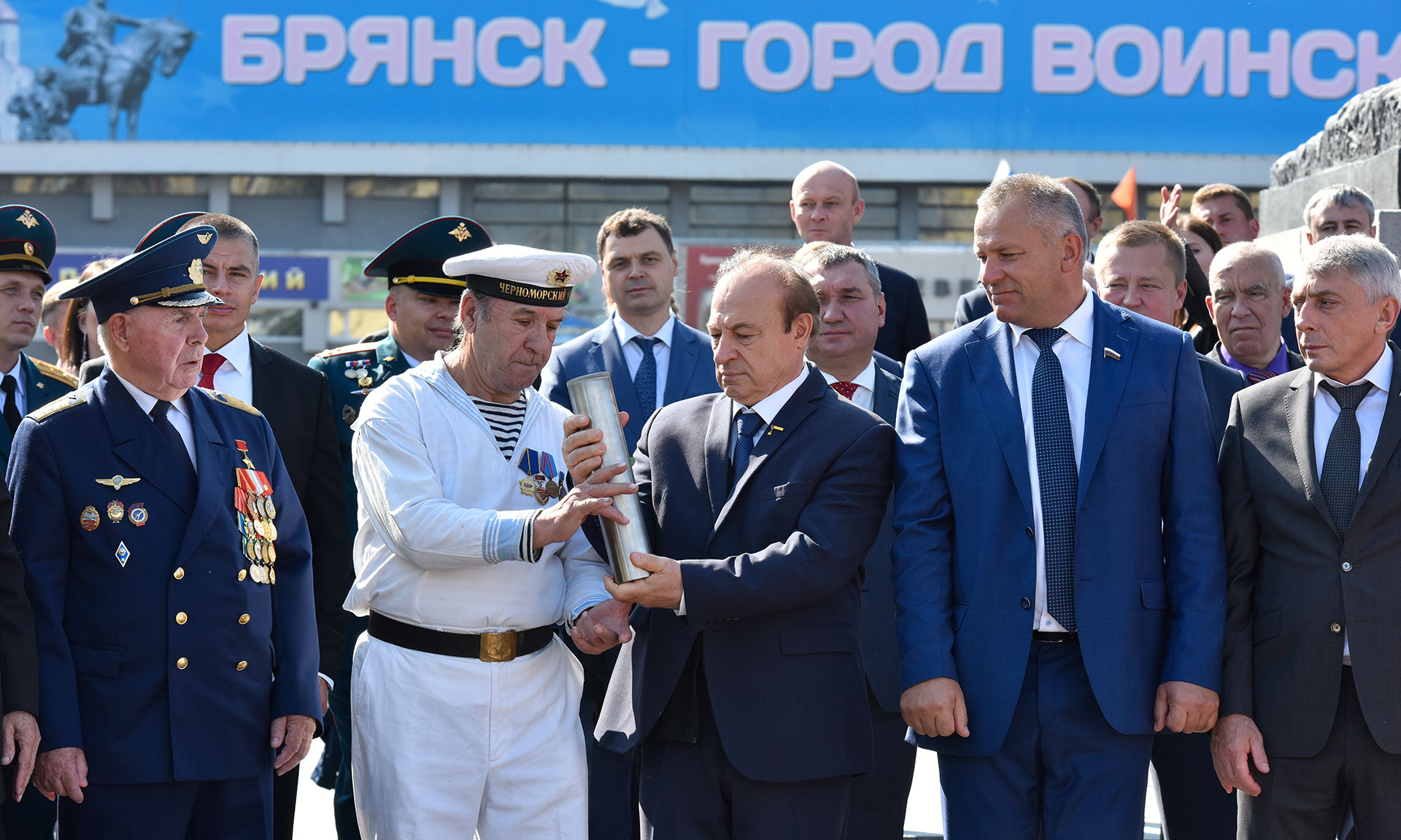 — Уважаемые гости, дорогие ветераны, жители Брянска и Брянщины, я всех сердечно приветствую на этой площади и поздравляю с этим историческим событием, которое совершается пред нашими глазами. Мы отправляем послание грядущим потомкам, в котором просим их, взирая на подвиг нашей жизни, на то, что мы так горячо служим нашей Родине, мы просим из также хранить заветы своих дедов и отцов, быть верными, и с любовью верно служить своему народу!
