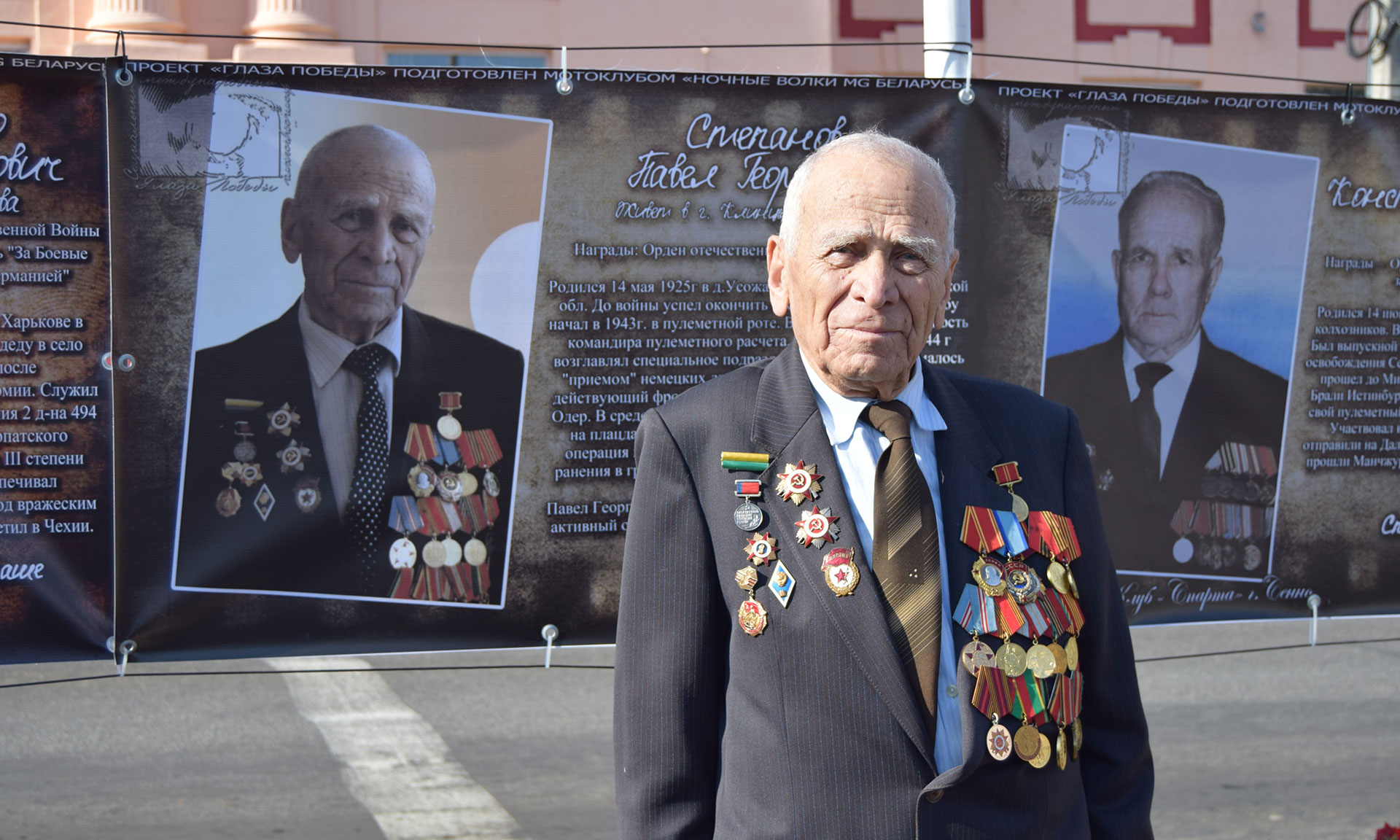 С самого утра жители могли полюбоваться выставкой, посвященной Великой Отечественной войне под названием «Глаза Победы», которую привез в Клинцы известный байкерский клуб «Ночные волки». Среди изображенных на выставке ветеранов был и клинчанин Павел Георгиевич Степанов.